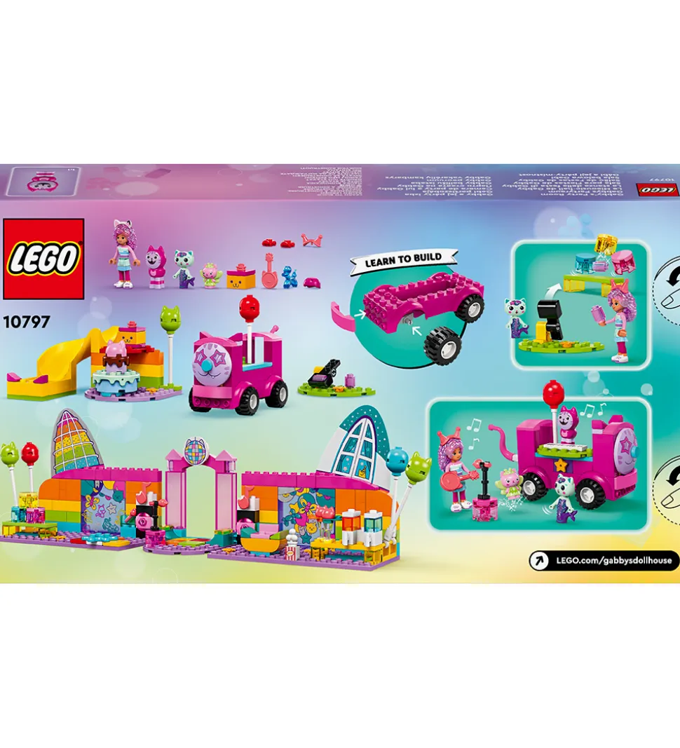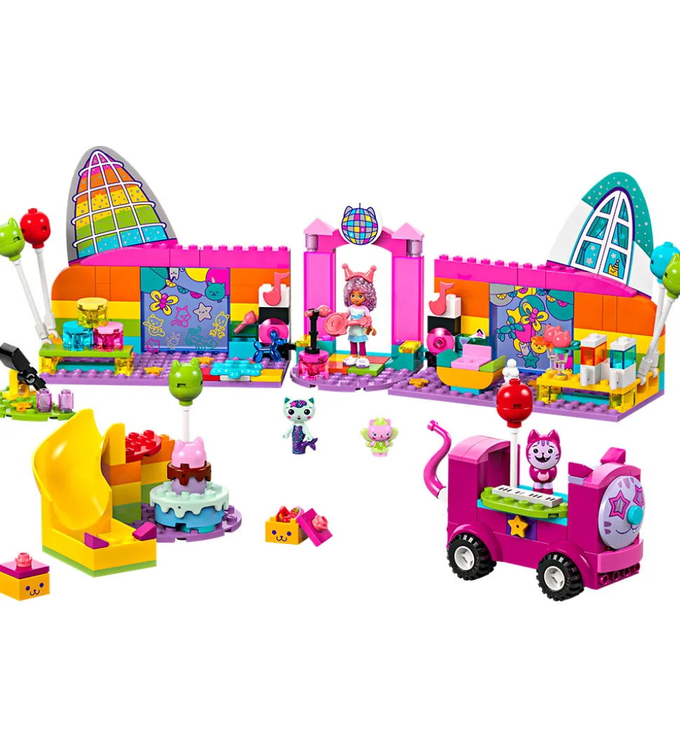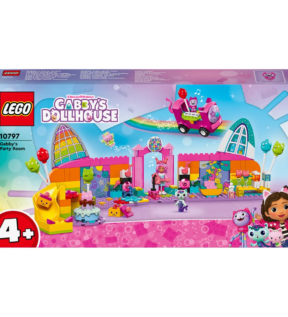 LEGO® Gabby’s Dollhouse sættet er det perfekte legetøj til det kreative barn, der vil bygge og lege med sættet, der indeholder Gabbys partyrum med figurer af Gabby, Daniel James “DJ” Katteurt, Alfekat og Havkat samt et udvalg af musik- og festlegetøj såsom. en partybus med indbygget keyboard, drejeligt dansegulv, guitar, 2 mikrofoner og en funklende diskokugle. Der medfølger tilbehør i form af balloner og rulleskøjter til rullediskoteket, popcorn og 2 glas slushice til afslapningszonen samt en katapult og dåser til væltespillet og desuden er en kage til Gabby og pakker med gaver indeni, som leveres ned ad legesættets rutsjebane.
