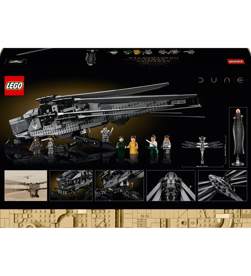 Sættet indeholder en gengivelse af Dune Atreides Royal Ornithopter-flyet med udfoldelige, flagrende vinger og udtrækkeligt landingsstel samt otte minifigurer af Paul Atreides, Lady Jessica, Gurney Halleck, Chani, Leto Atreides, Liet Kynes, Duncan Idaho og baron Harkonnen i sin lange kappe.