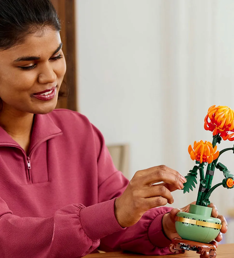 Skønt LEGO® Icons sæt med i alt 278 klodser, som kan samles til en smuk, orange krysantemum i en pastelgrøn potte og sokkel med træeffekt.