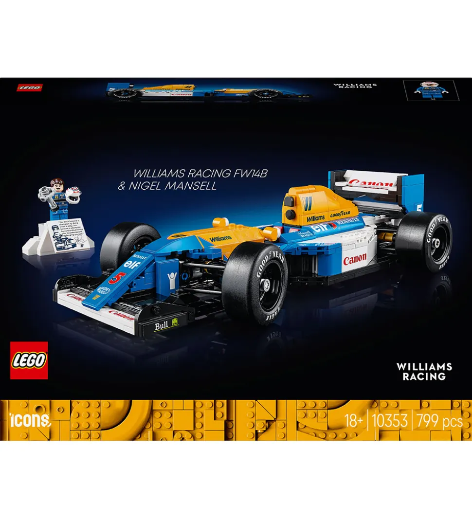 Imponerende LEGO® Icons sæt med 799 klodser, der kan samles til en detaljeret model af Williams Racing FW14B. Sættet er en hyldest til den ikoniske Formel 1-racerbil, der blev kørt af Nigel Mansell, og indeholder autentiske designelementer og sponsorlogoer.
