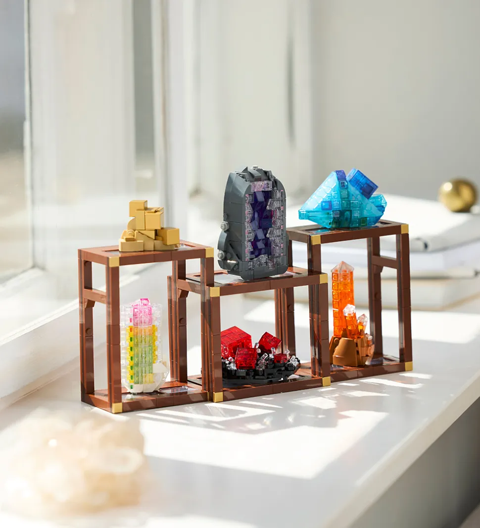 LEGO® Ideas sættet giver mulighed for at bygge flere detaljerede modeller, herunder geoder og krystalformationer i forskellige farver. De mange transparente elementer skaber en realistisk og elegant effekt, der gør modellen til en særlig udstillingsgenstand.