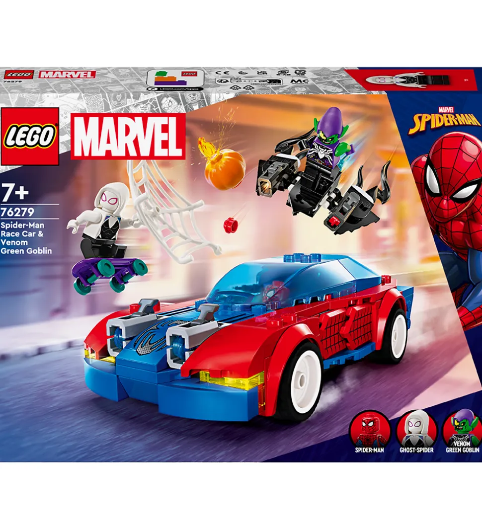 Fedt LEGO® Marvel Spider-Man sæt med i alt 227 klodser, som kan samles til Spider-Mans racerbil og Venom Green Goblin.