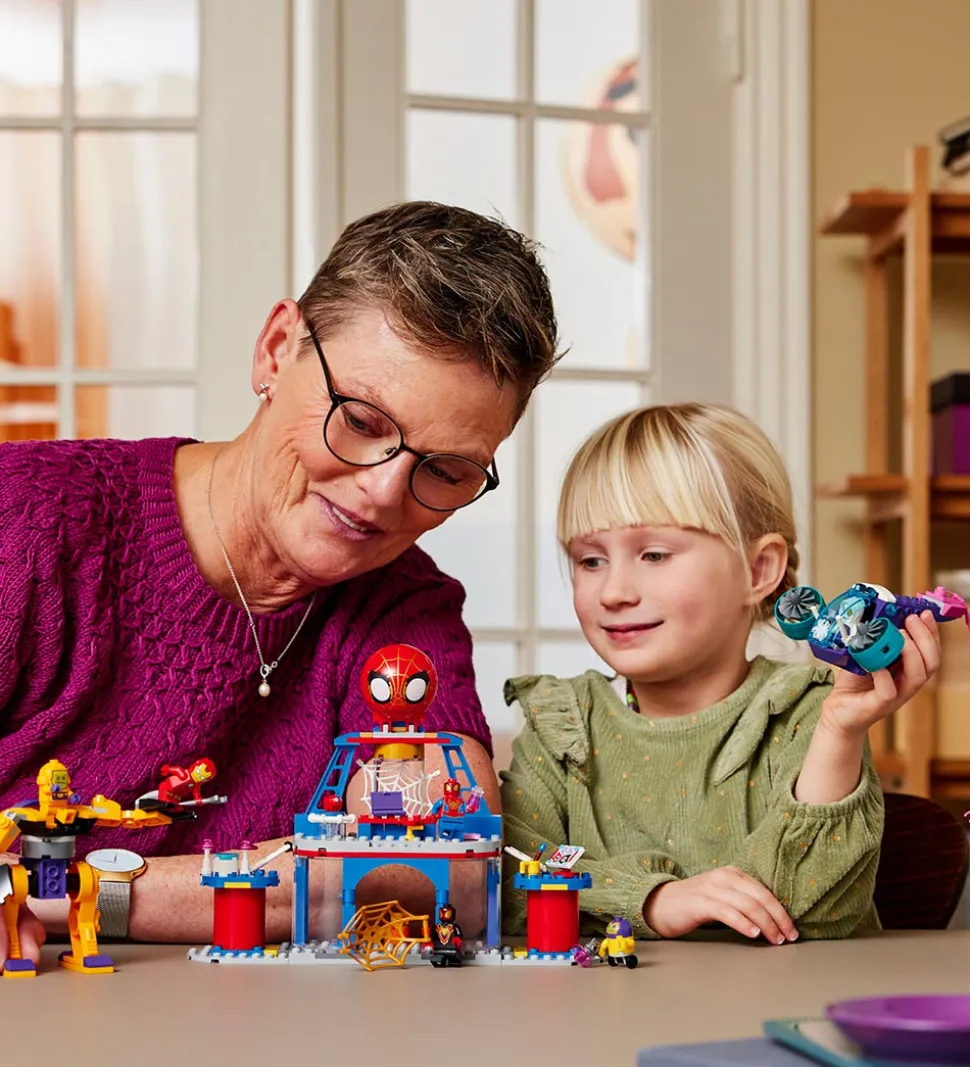 LEGO® Marvel Spider-Man sættet er det perfekte legetøj til det kreative barn, der vil bygge og lege sættet, som indeholder minifigurer af Spidey, Iron Man, Miles “Spin” Morales, Ghost-Spider og Zola. Der er en stor mech-robot til Zola med bevægelige ben og kløer, der kan gribe fat i en minifigur, og en glidespinner med drejelige propeller, et cockpit, der kan åbnes, og et stort, lyserødt netelement.