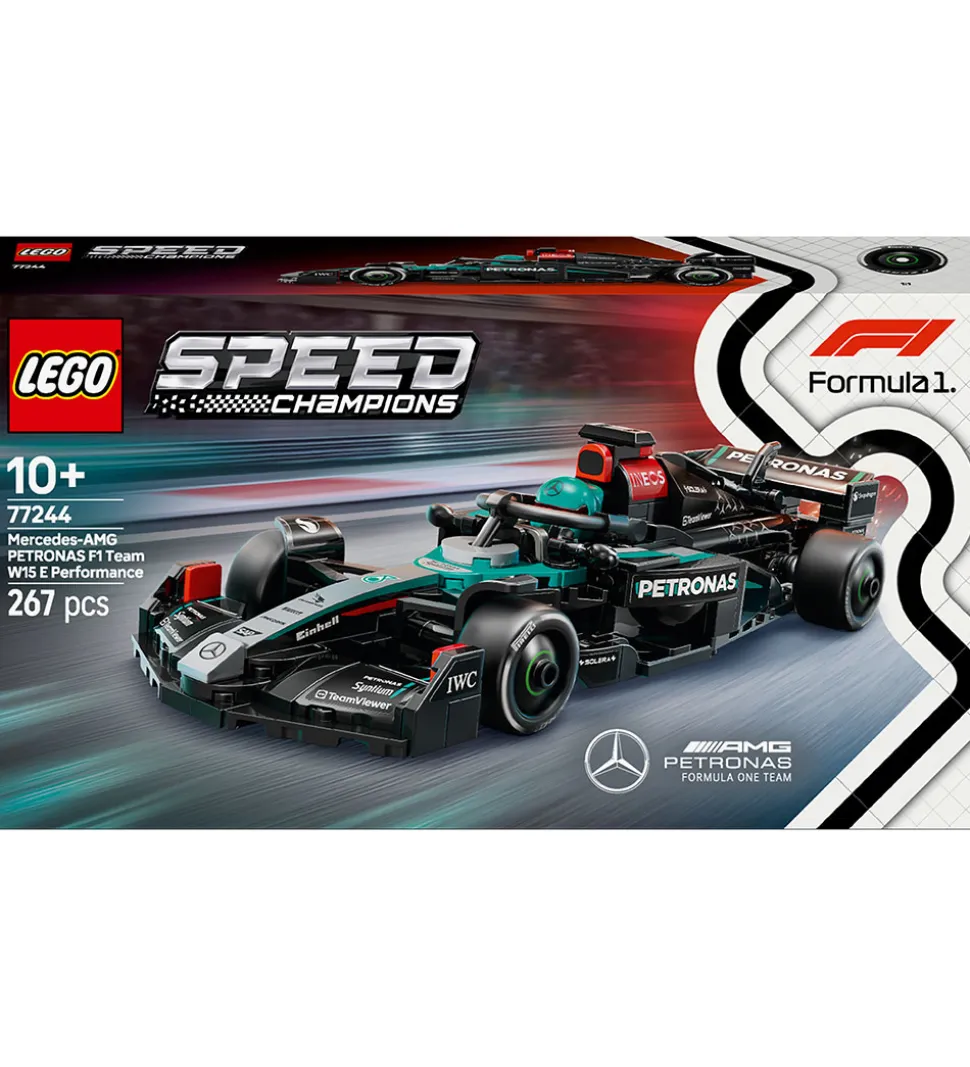 Flot LEGO® Speed Champions sæt med 267 klodser, der kan samles til en detaljeret model af Mercedes-AMG PETRONAS F1 Team W15 E Performance. Modellen gengiver racerbilen med realistiske detaljer og autentiske designelementer.