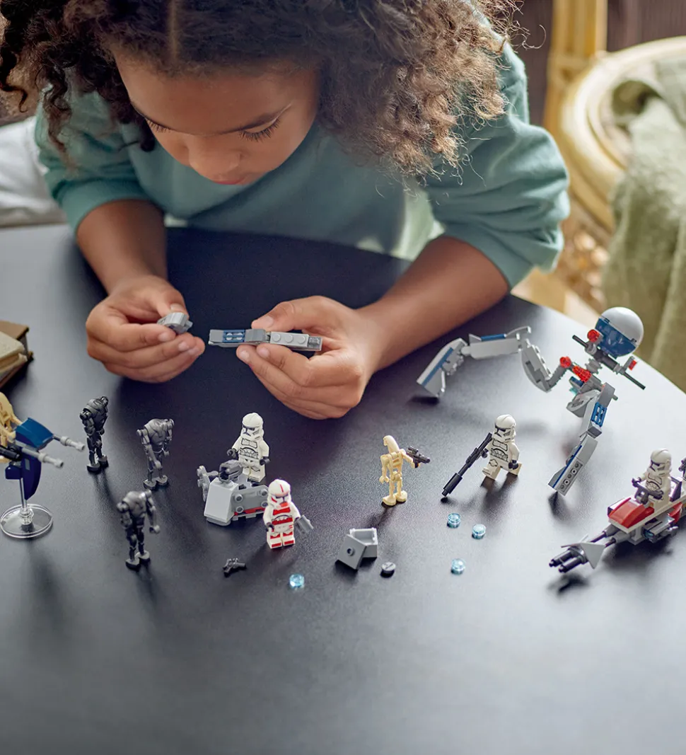 LEGO® Star Wars sættet er perfekt til det kreative barn, der vil bygge og lege med battle packen, som indeholder en klon-stødsoldat, tre klonsoldater, tre superkampdroider og to kampdroider med ikoniske våben. Sættet omfatter også en knopskydende Star Wars speedercykel til to klonsoldater og en STAP-speeder til en kampdroide samt en tri-droide med tre knipseskydere og en forsvarsstilling med en knopskyder.