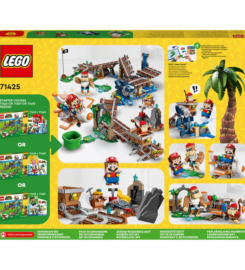 Med LEGO® Super Mario udvidelsessættet kan der føjes endnu en sej udfordring til den eksisterende samling af LEGO® Super Mario baner. I dette udvidelsessæt skal den interaktive figur køre rundt på banen i en minevogn. Vip en Snaggles af vejen, reparer den ødelagte del af sporet, overvind Mole Miner og “spræng” klippen for at afsløre en klase bananer, som du kan “spise” eller give som gave til Funky Kong eller Diddy Kong. Køb balloner fra flybutikken, og “‘flyv” i flyet for at optjene flere digitale mønter.