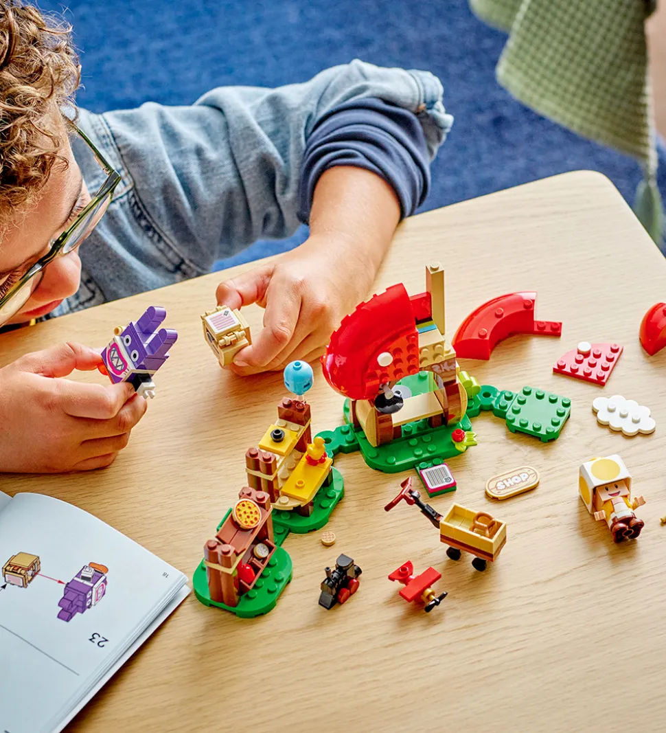 Med LEGO® Super Mario udvidelsessættet kan der føjes endnu en sej udfordring til den eksisterende samling af LEGO® Super Mario baner. Dette udvidelsessæt indeholder to klodsbyggede figurer af Gul Toad og Nabbit samt en butik, der kan bygges, med diverse tilbehør i form af legetøj og mad samt en indkøbsvogn.