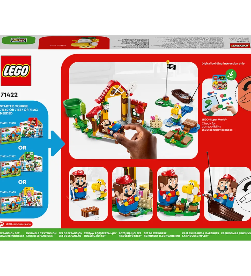 Med LEGO® Super Mario udvidelsessættet kan der føjes endnu en sej udfordring til den eksisterende samling af LEGO® Super Mario baner. Dette udvidelsessæt indeholder en byg selv-figur, gul Yoshi, som Mario/Luigi/Peach-figuren kan sige hej til. På banen kan den interaktive figur også kan sove på sengen, “spise” en snack fra picnickurven, “vande” grøntsagerne i haven, tage på fisketur, spille hockey med picnicbordet som mål og meget mere.