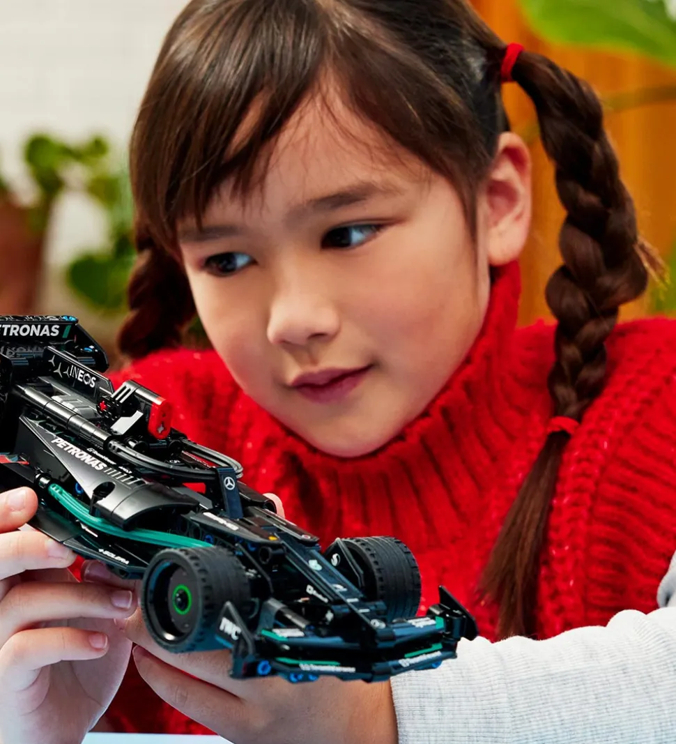 Imponerende LEGO® Technic sæt med i alt 240 klodser, som kan samles til en Mercedes-AMG F1 W14 E Performance pull-back.
