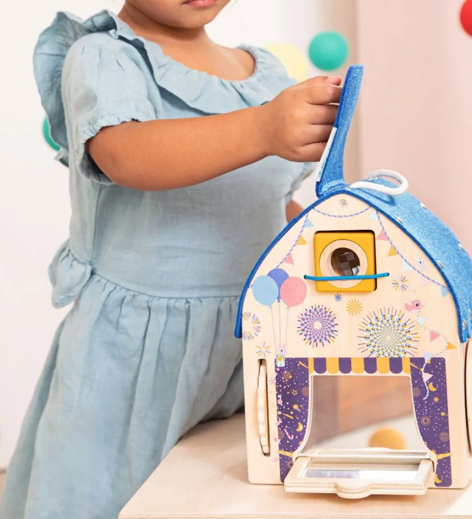 Sjovt Lilliputiens aktivitetshus i træ med filttag og fine illustrationer i et illusionist-tema.