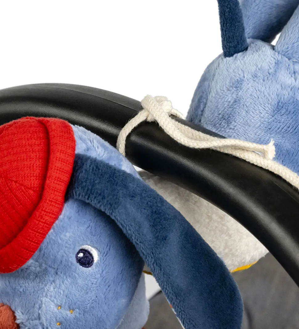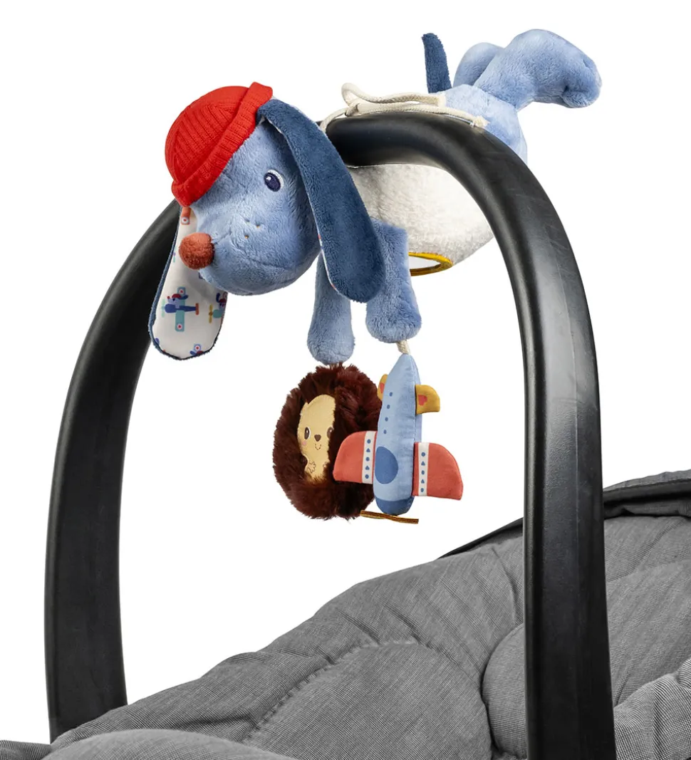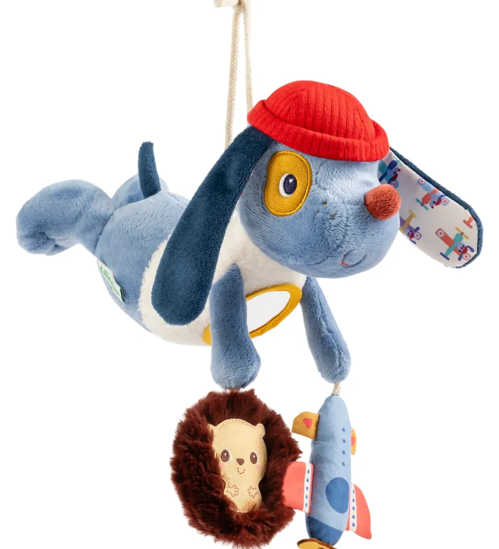 Skøn Lilliputiens aktivitetslegetøj i form af hunden Jules i blå og hvid med en rød hue og farverige detaljer. Hunden har et spejl på maven, en knitrende flyvemaskine i den ene hånd og en rangle med farverige kugler og spejl indvendigt i den anden hånd. Hunden har en snor bagpå, så man kan hænge den fast på f.eks. et legestativ, så barnet kan ligge og lege med den.