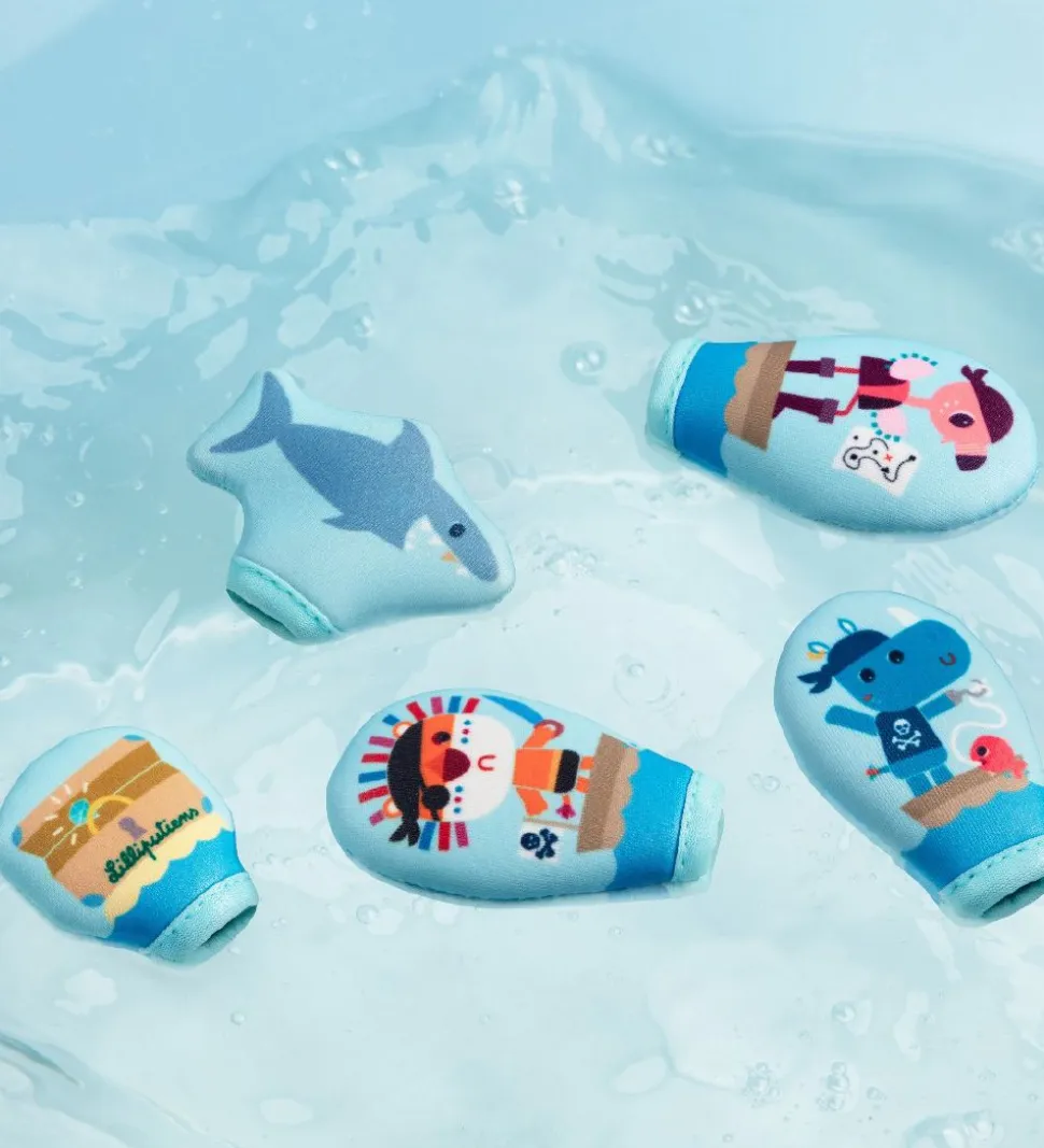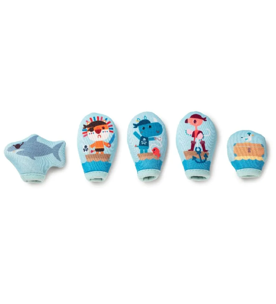 Underholdende Lilliputiens badefingerdukker består af 5 dele i blå af en haj, en skat og tre sjove pirater i forskellige farver.