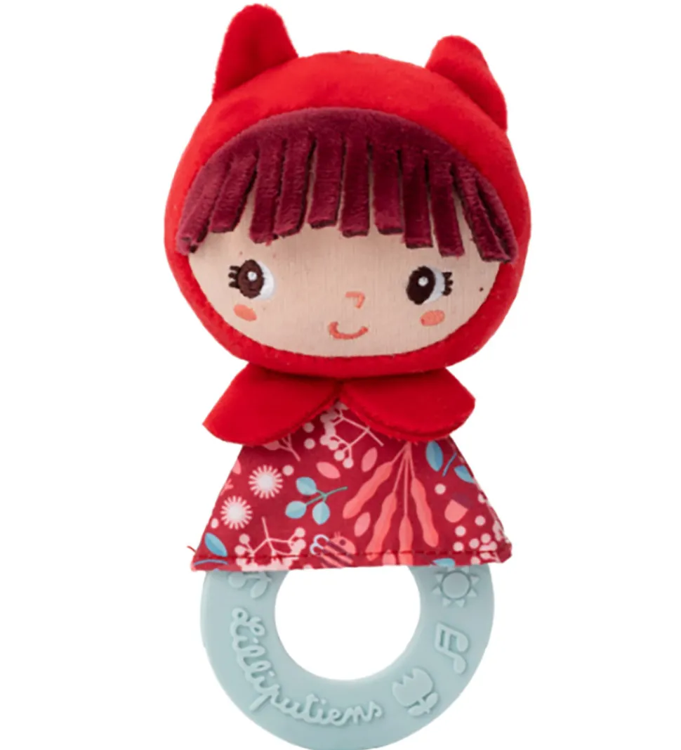 Sød Lilliputiens biderangle med Rødhætte i røde og grønne farver.