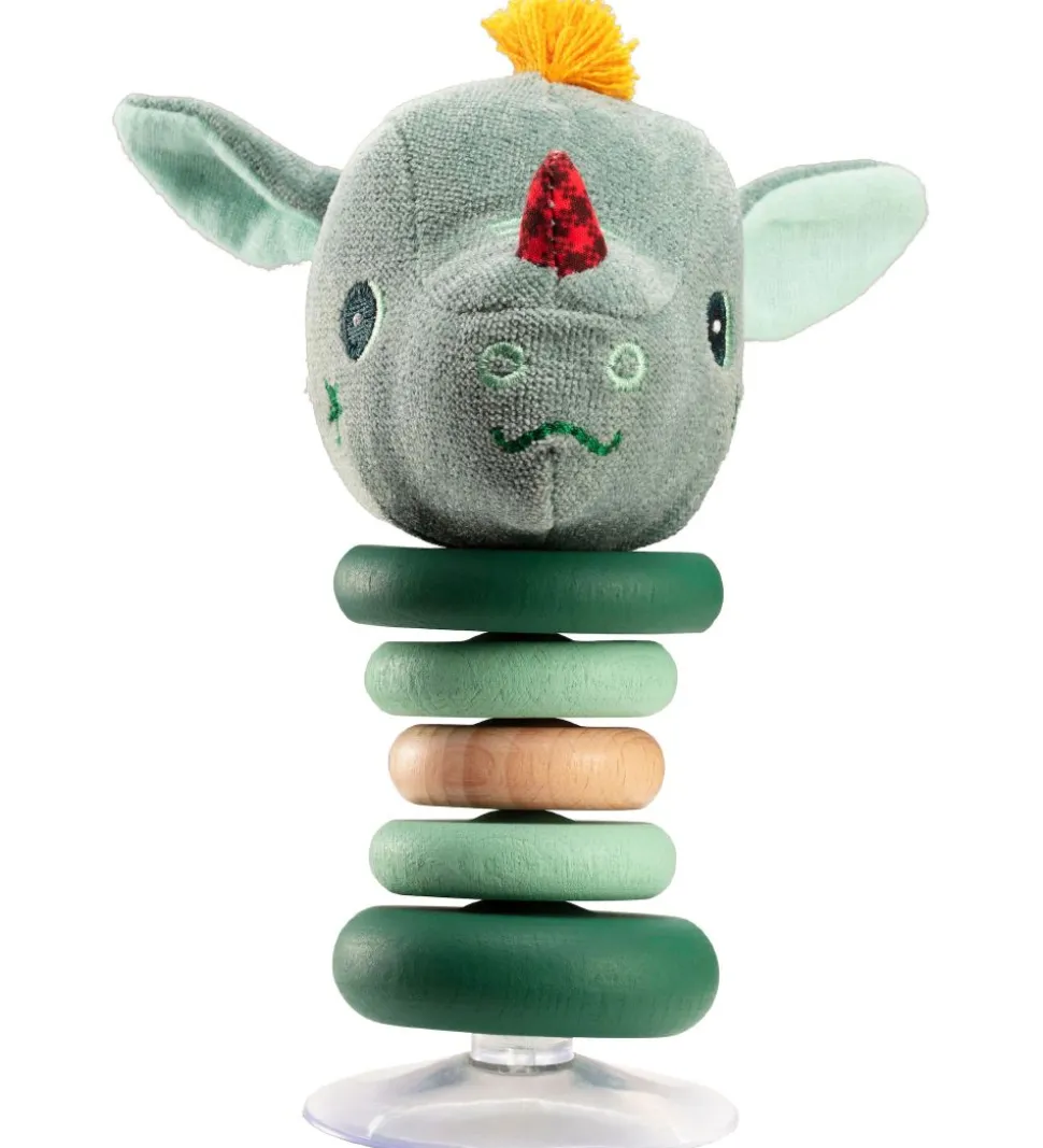 Fin Lilliputiens rangle i grøn med et drage-hoved på toppen med træ-ringe i naturligt træ og grøn.