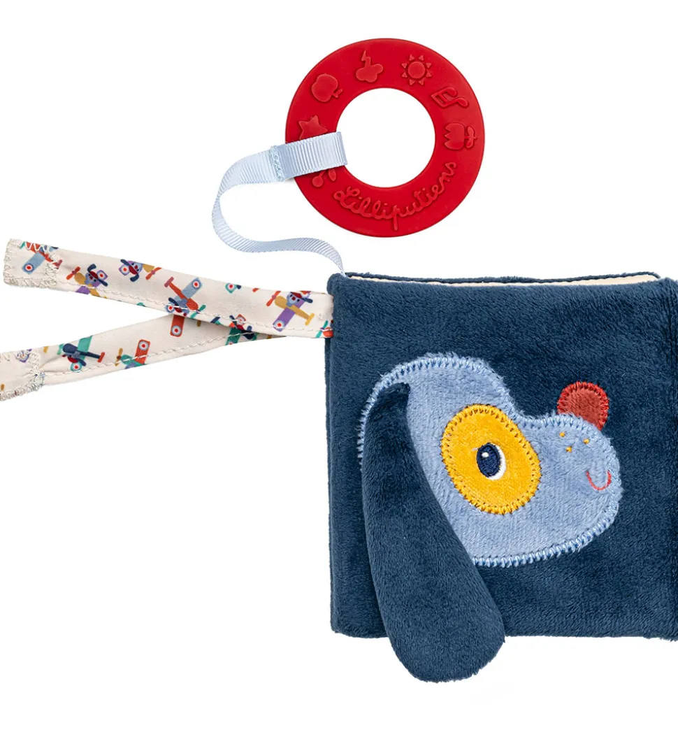Fin Lilliputiens stofbog i et blåt farvetema med hunden Jules på fronten. Lilliputiens stofbogen er sjov og spændende at lege med på grund af de forskellige farver, motiver og materialer. Bogen består af seks sider med nulreflapper, knitrepapir og en bidering.