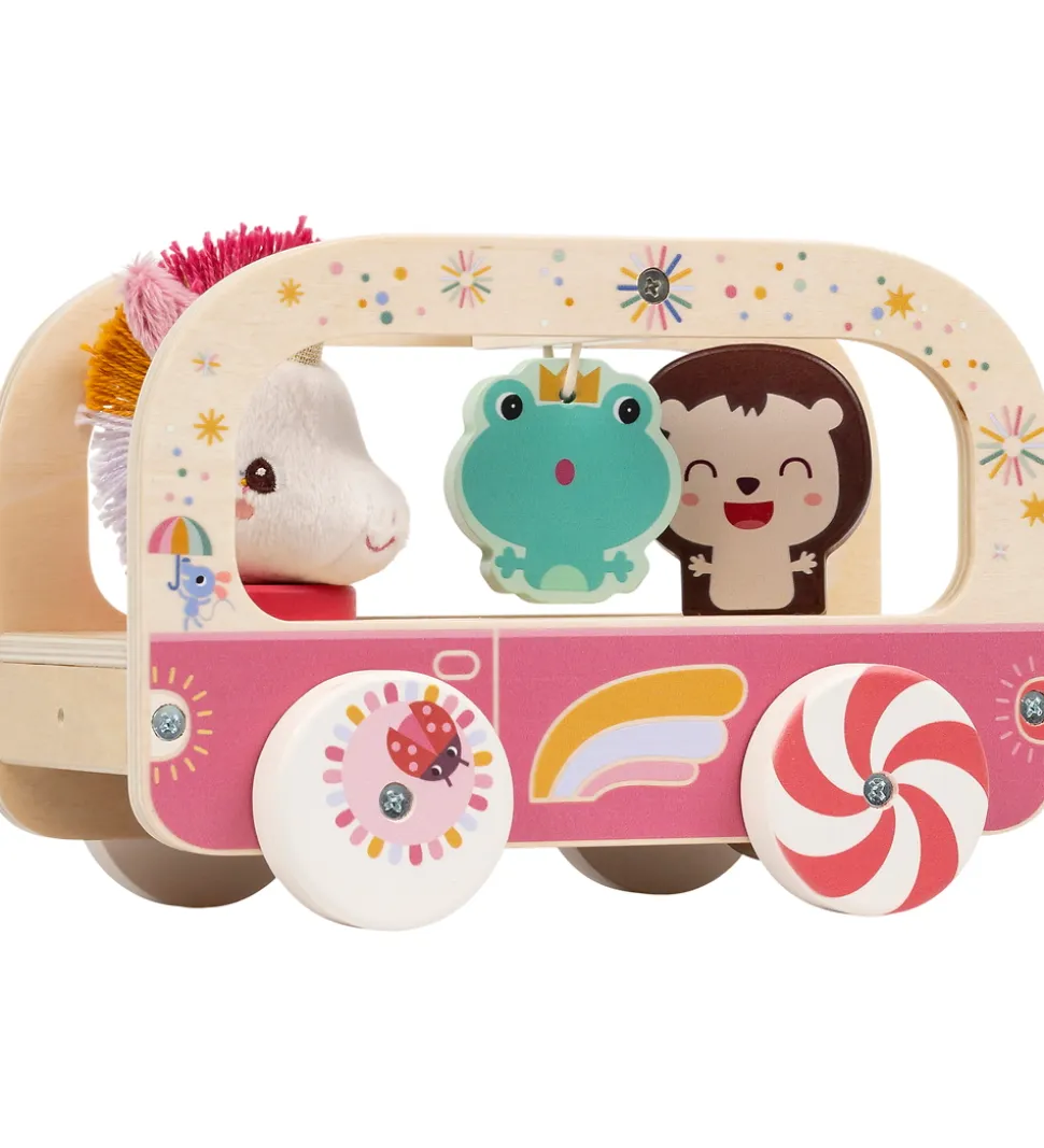 Sjovt træklegetøj fra Lilliputiens formet som en bus i træ med farverigt og eventyrligt print. I bussen sidder enhjørningen Lena og et lille brunt dyr. Enhjørningen er blød og kan tages ud af bussen mens det brune dyr er lavet af træ, og drejer rundt når bussen kører. Bussen er udstyret med en frø, som hænger i midten og fire hjul med billeder på siderne, som skaber en optisk illusion når de drejer rundt. Bussen trækkes med en snor foran.