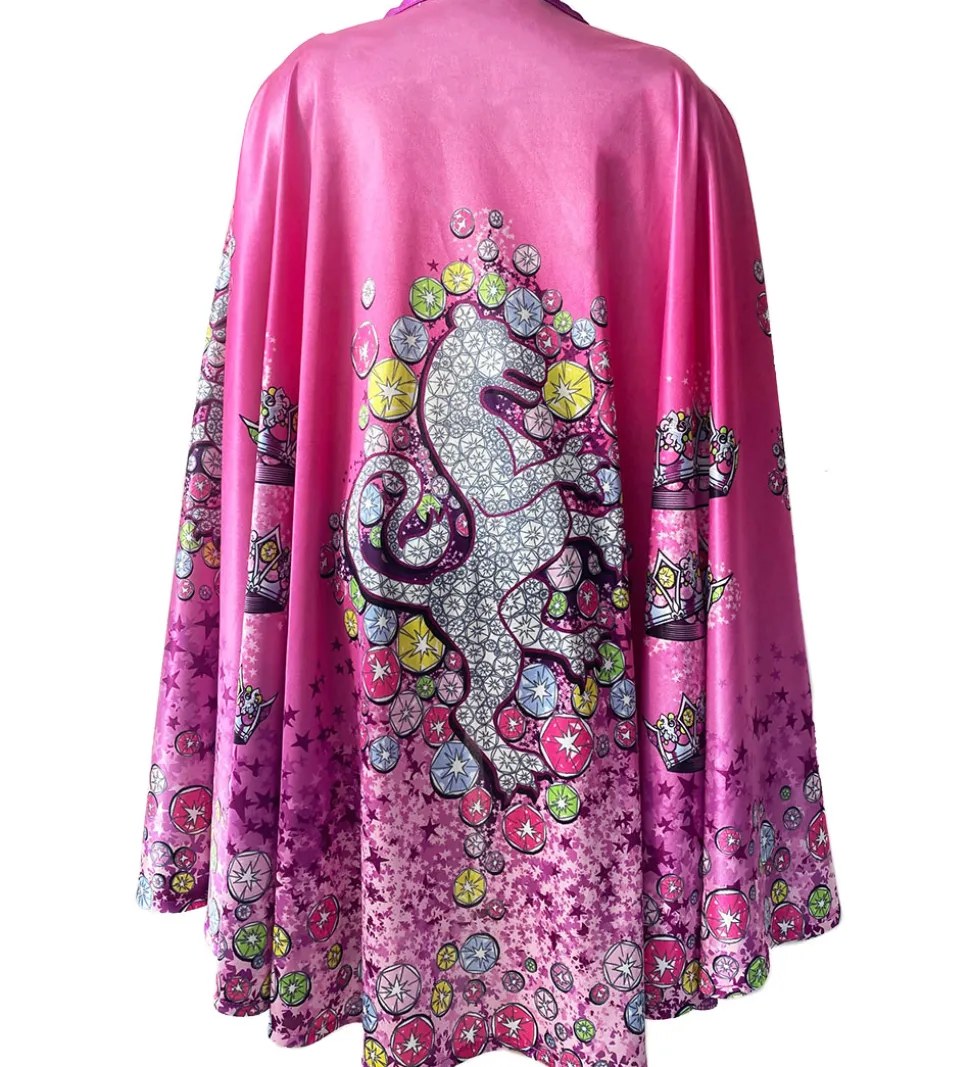 Flot Liontouch prinsessekappe i skinnende pink med et hesteprint bagpå og mange farverige detaljer. Prinsessekappen lukkes fortil med en velcrolukning.