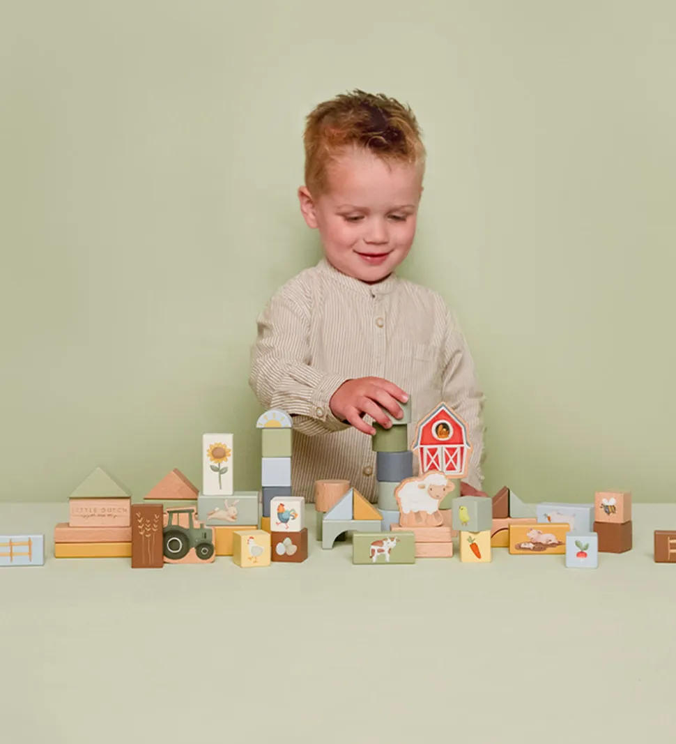 Fine Little Dutch byggeklodser bestående af 50 træklodser malet i forskellige nuancer og med et hygeligt bondegårdstema.