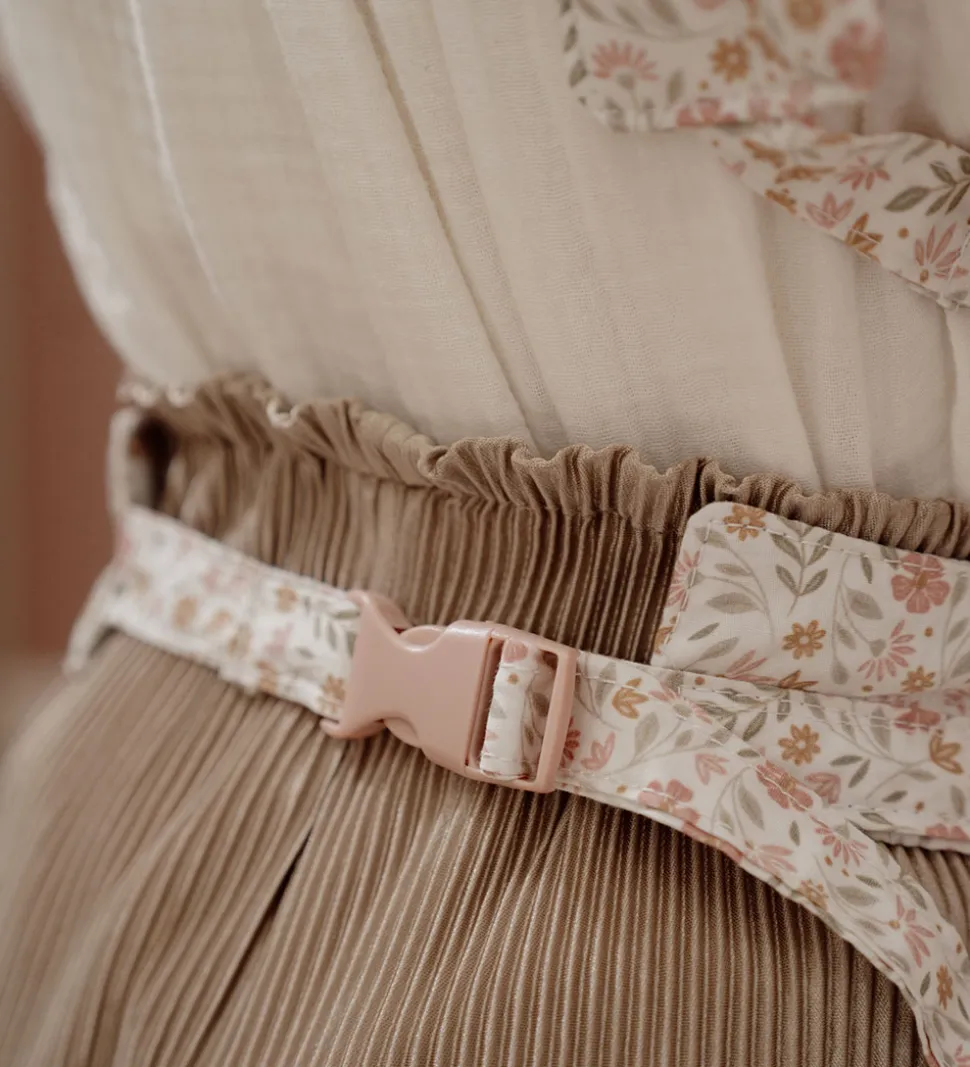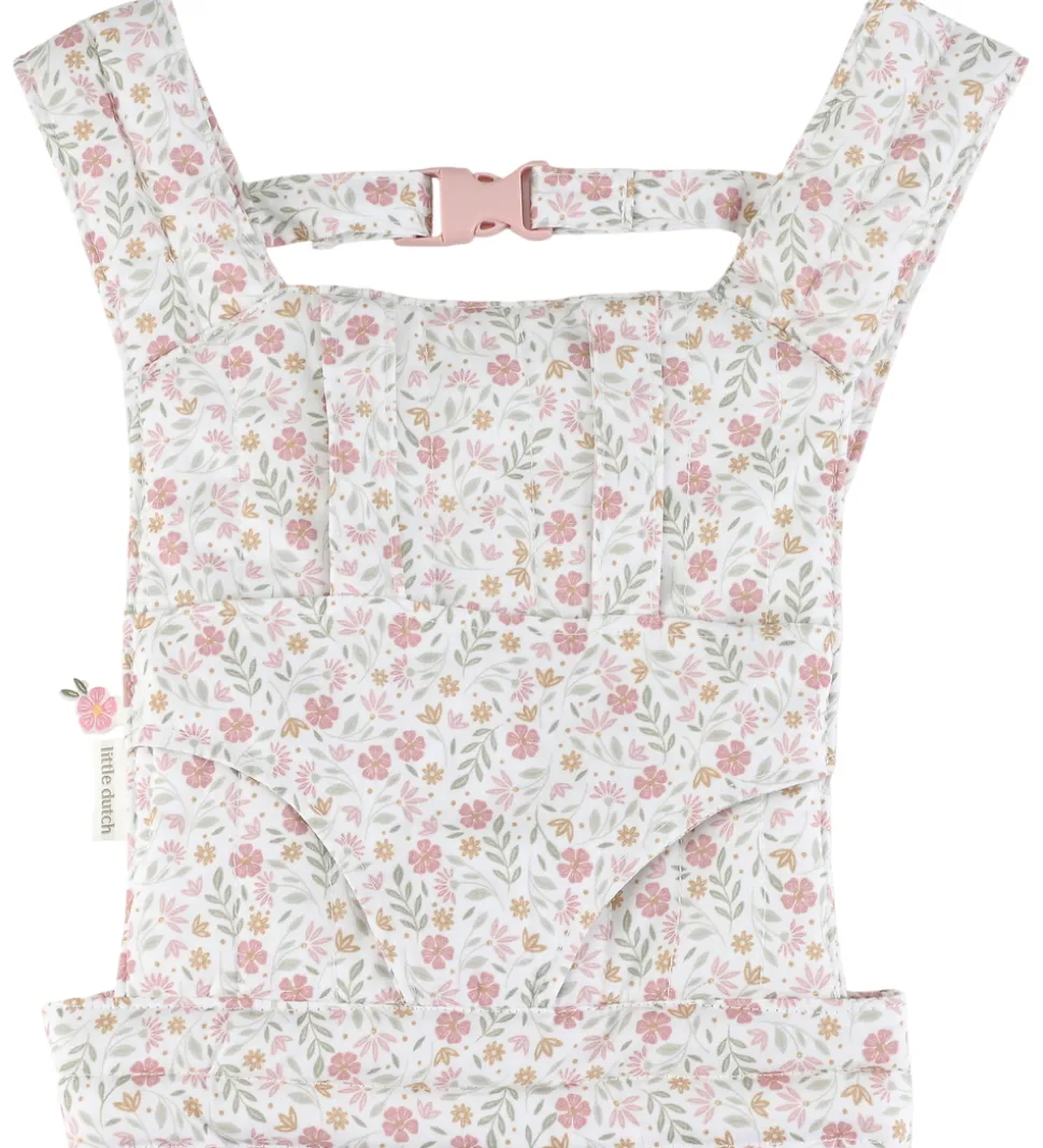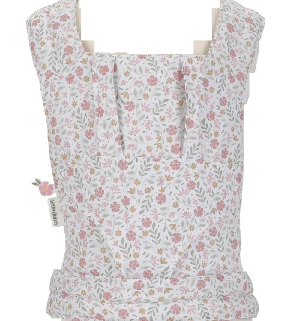 Charmerende Little Dutch dukkebæresele i hvid med et blomstermønster i rosa og grønne nuancer. Little Dutch dukkebæreselen er designet med justerbare, polstrede skulderremme og et hoftebælte, der sikrer nem brug.
