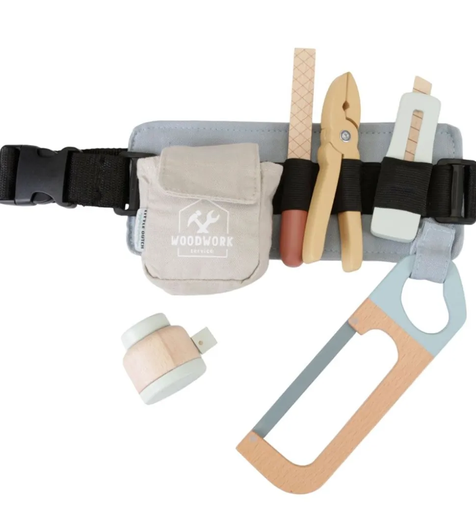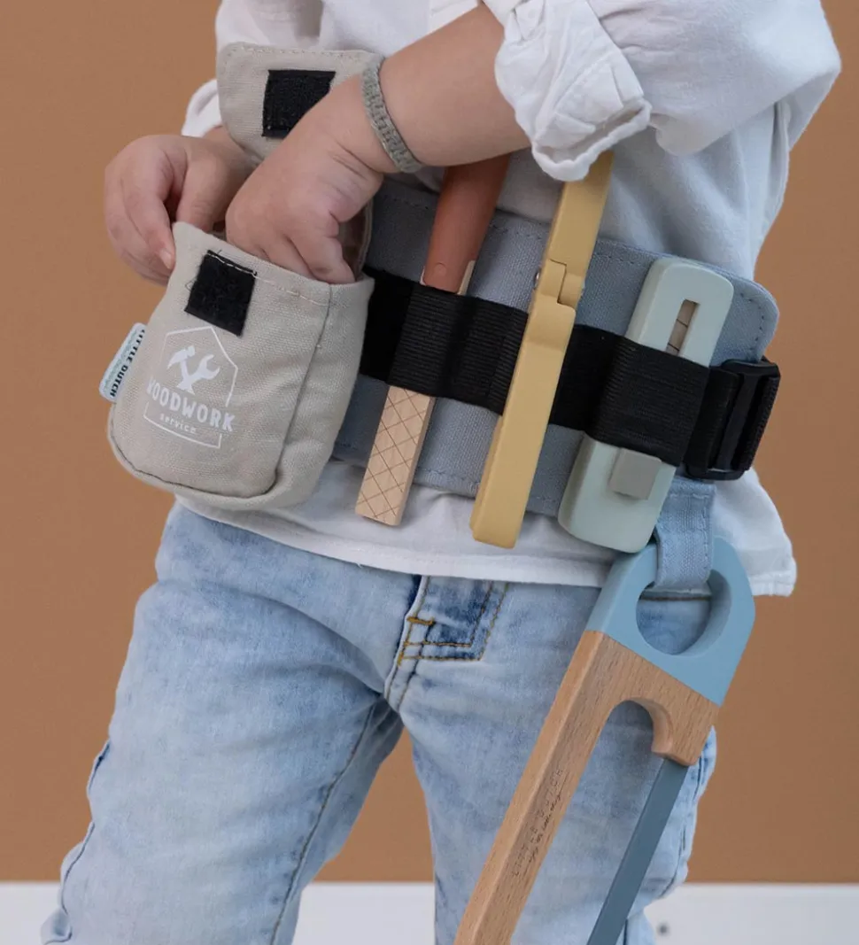 Little Dutch værktøjsbæltet har en lomme og små stropper på fronten, så der er plads til mange forskellige værktøjer. Bæltet åbnes med en plastikspænde, og barnet kan justerer den i længden, så den sidder helt perfekt. Værktøjet er lavet i en flot trækvalitet. Værktøjsbæltet er med til at udvikle barnets fantasi og finmotorik.