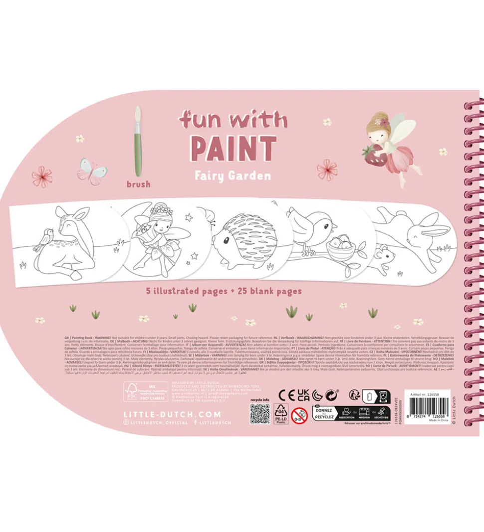 Little Dutch malebogen inkluderer fem sider med tegninger, som kan males og 25 blanke sider. Malebogen har fire vandfarver og kommer med en pensel. Malebogen er perfekt til kreative stunder.