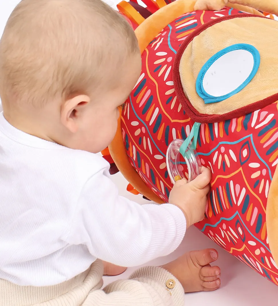 Ludi cylinderen er oppustelig og indvendigt er der kugler, som laver spændende lyde når den ruller rundt. I den ene ende er der et spejl og på siden er der et håndtag. Cylinderen er perfekt til de små, som stadig er ved at udvikle motorikken og de flotte farver og lyde er med til at stimulere sanserne.