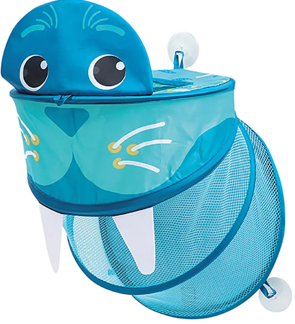 Sjovt Ludi opbevaringsnet til badet i blå med form som en hvalros med et ansigt og store tænder.