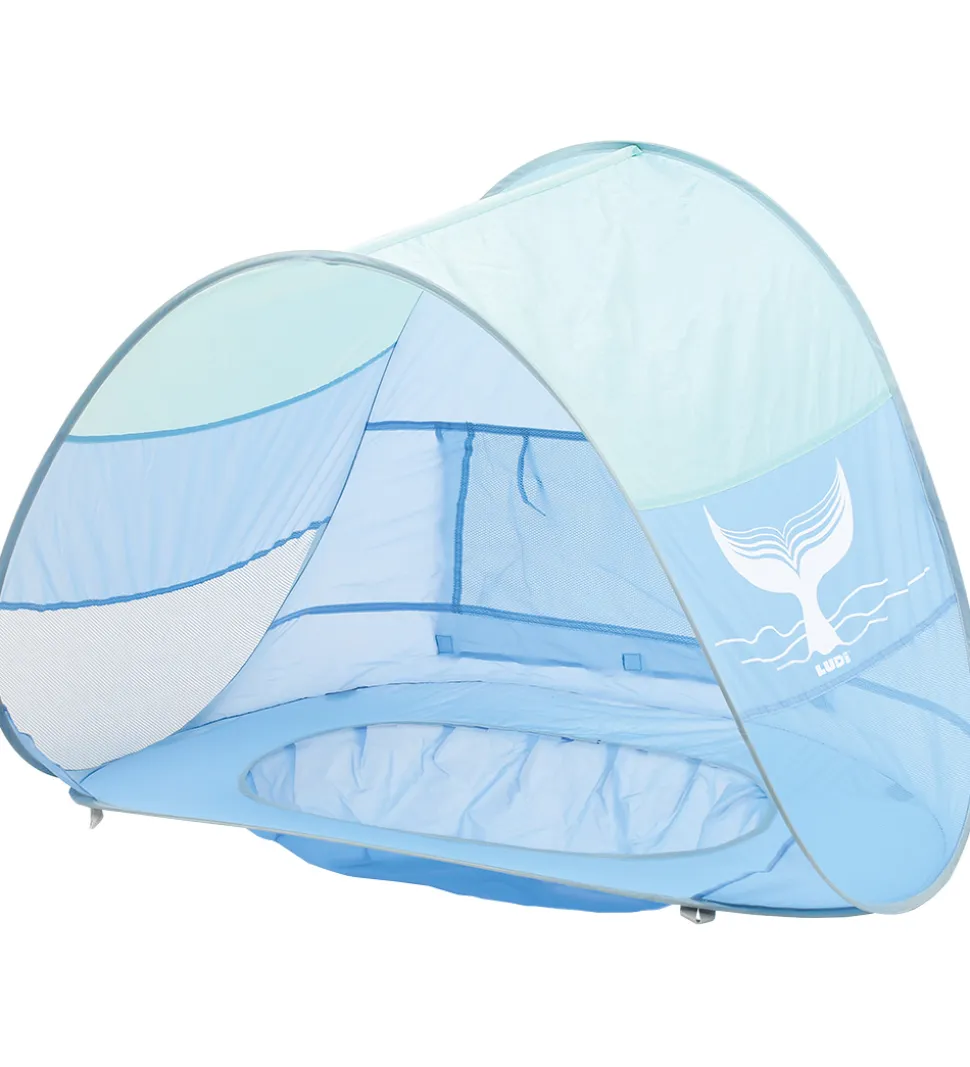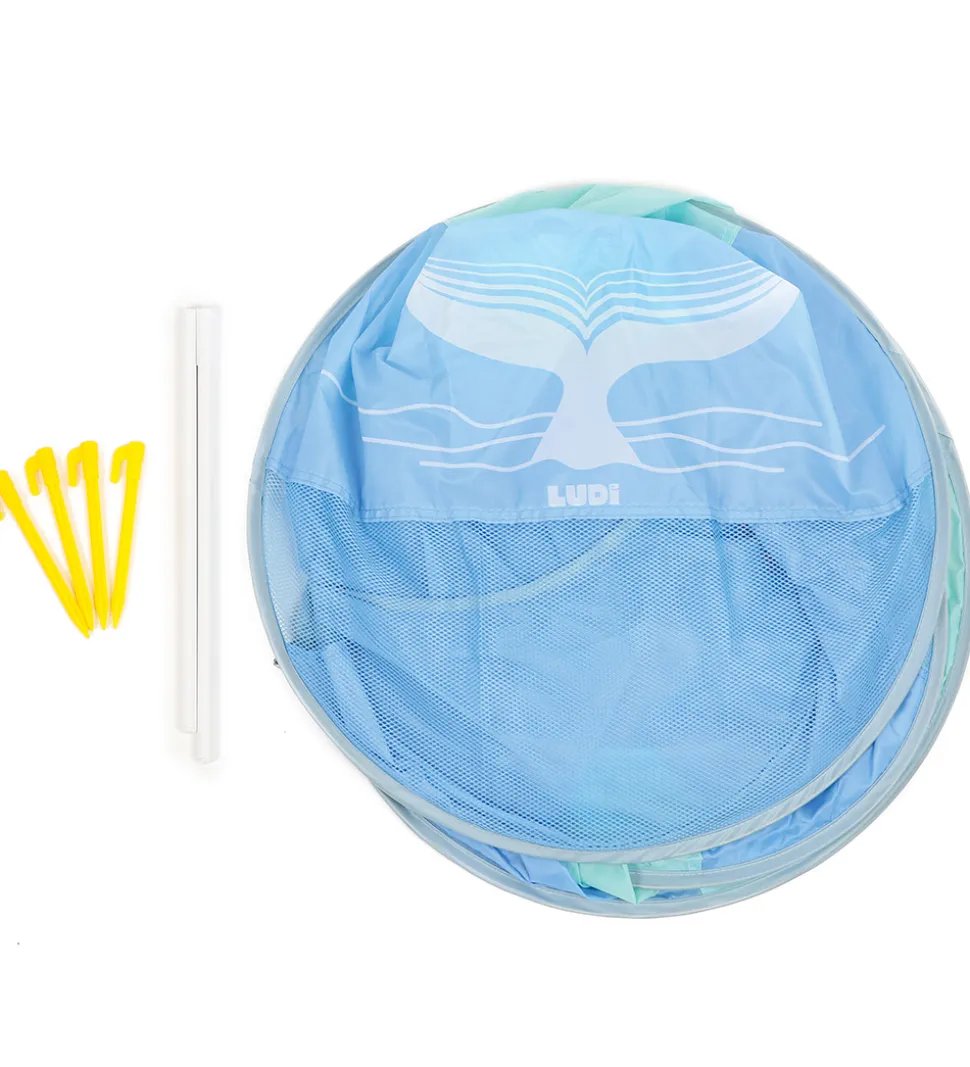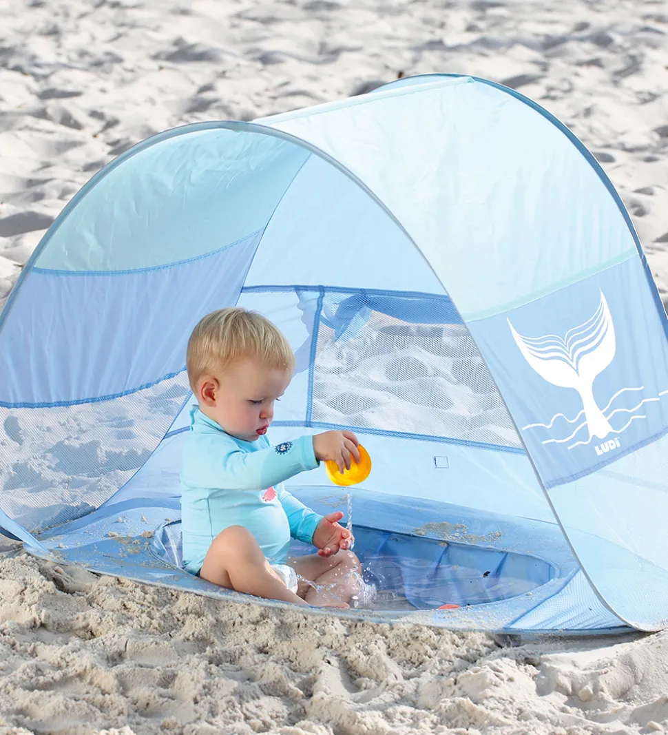 Ludi skyggeteltet er perfekt til stranden eller haven, når baby har brug for et skygge sted. Skyggeteltet er let og hurtigt at folde ud og sammen igen, med det smarte system tager det kun ét minut. Teltet fastgøres med fire medfølgende pløkker i hjørnerne, så det sidder godt fast. I midten er der et bassin, som kan fyldes med vand.
