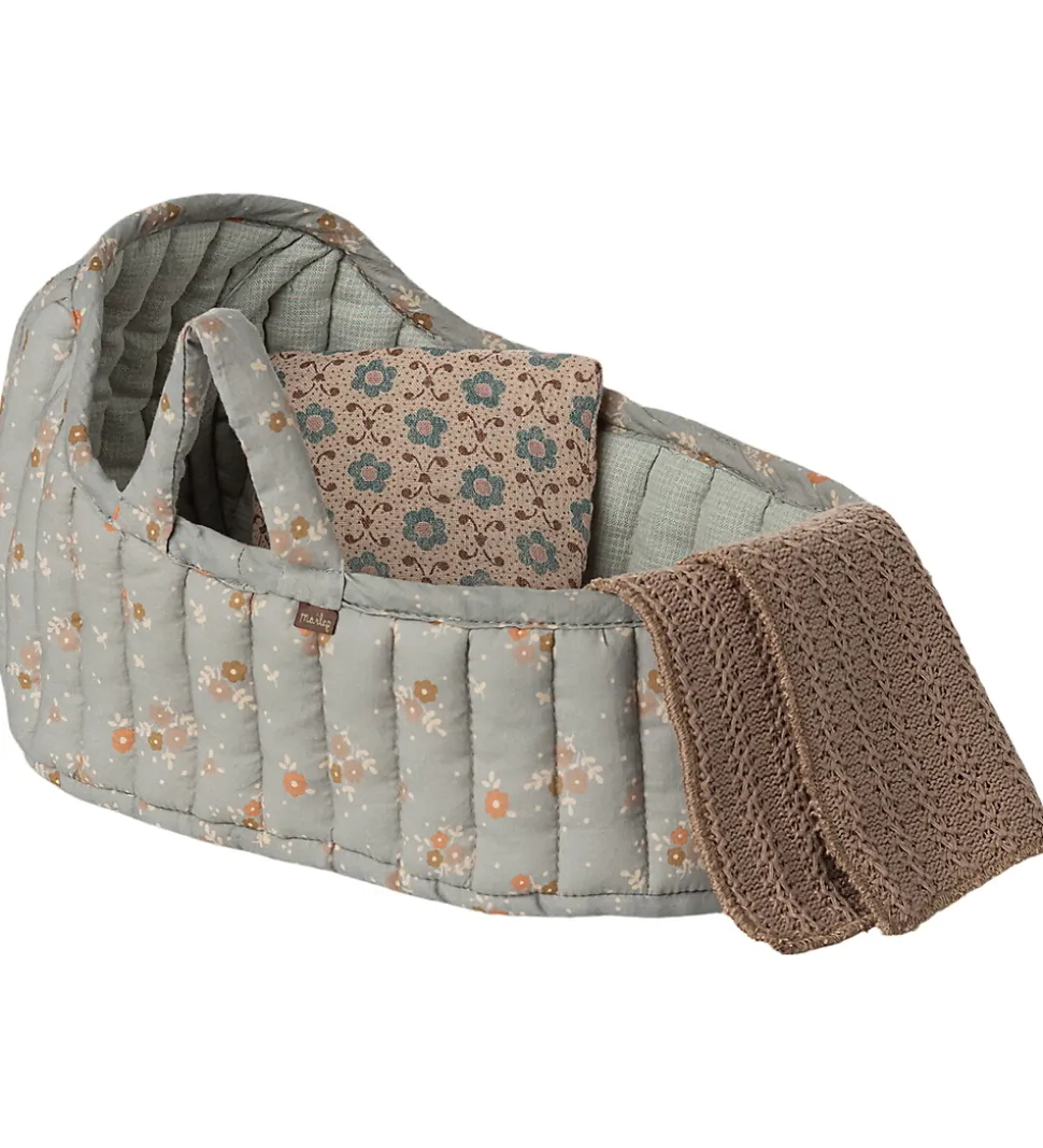 Charmerende Maileg babylift i en blød blå med et sødt blomstermønster. Maileg babyliften inkluderer en flot pude og et tæppe, som perfekt kompletterer det fine design.