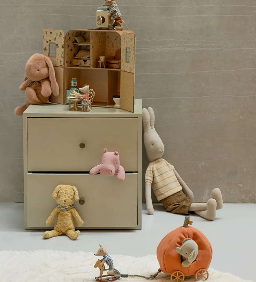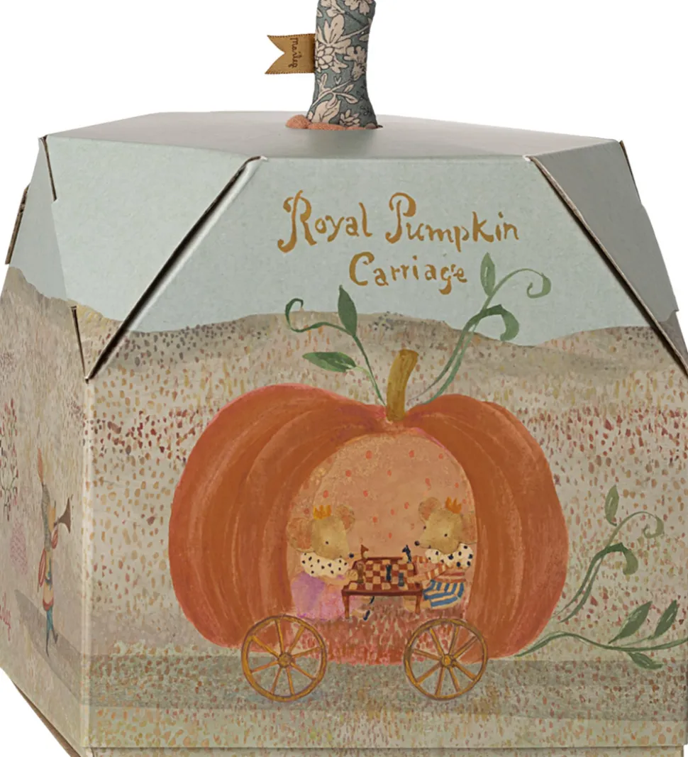 Maileg græskarkareten passer til Mailegs legetøj i størrelse musefamilie og gør familielegen komplet. Kareten har hjul og en træksnor, så den kan trækkes af sted.