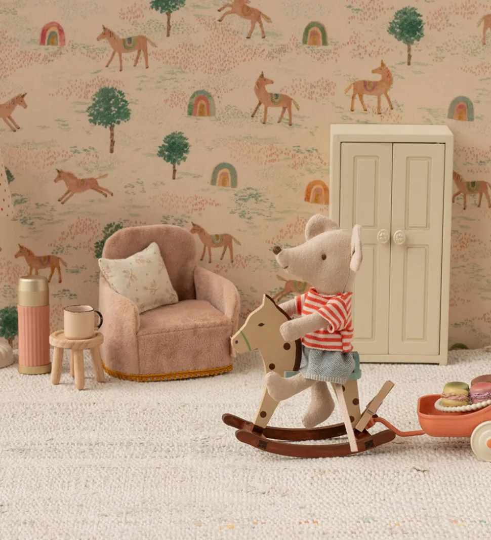 Charmerende Maileg gyngehest i en lys, beige nuance med brune prikker. Maileg gyngehesten har flotte detaljer som et blåt sæde og brun bund, der giver en nostalgisk følelse. Perfekt til dukkelegen.