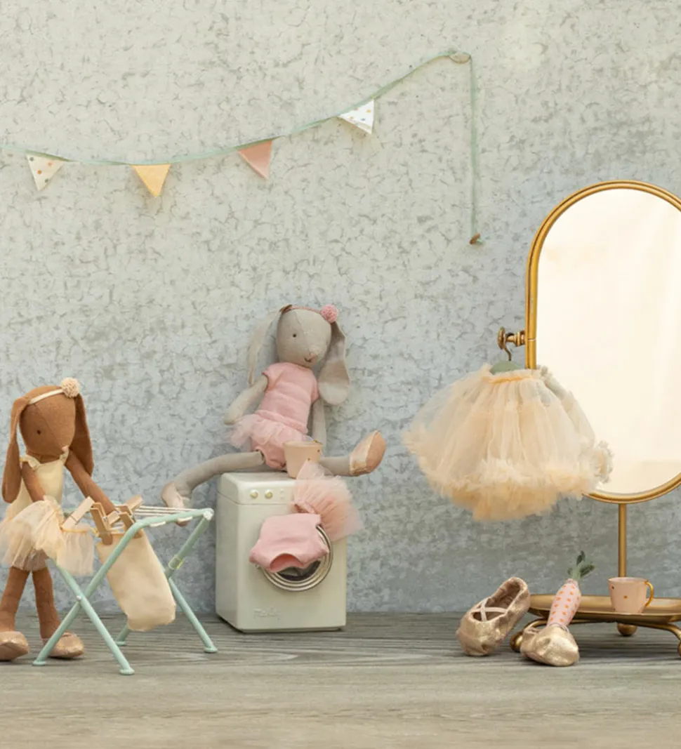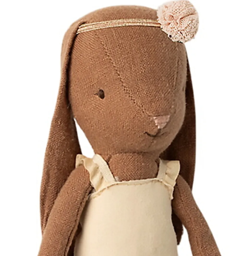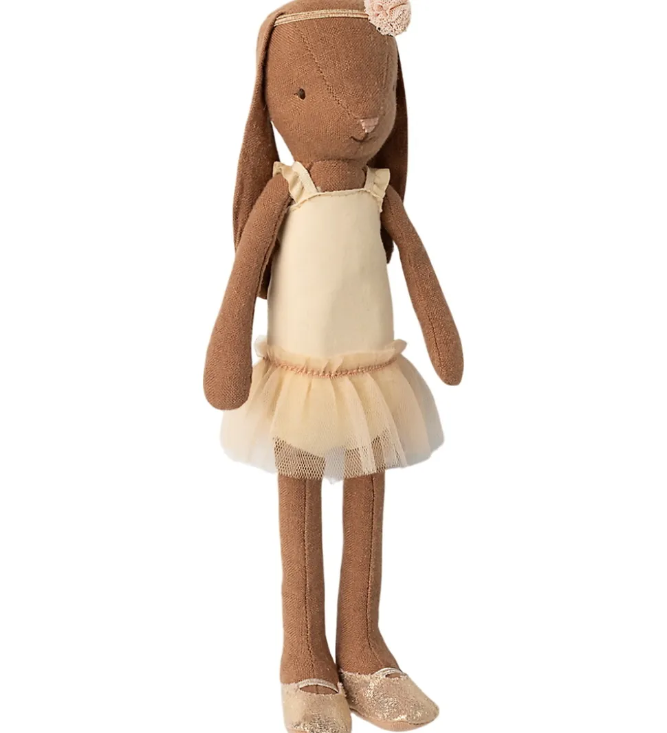 Fin Maileg kanin i brun iført en gul balletdragt og et tylskørt.