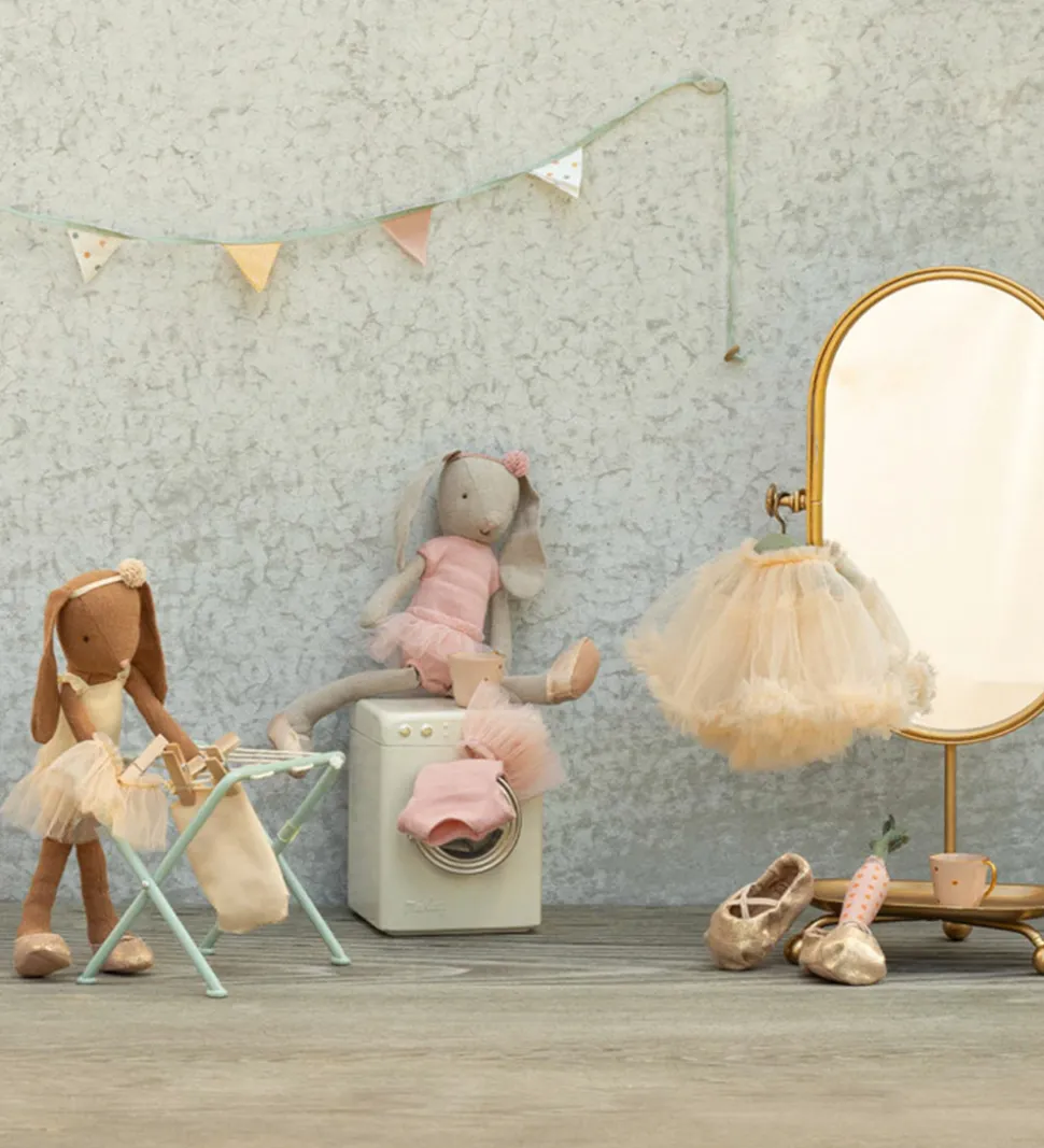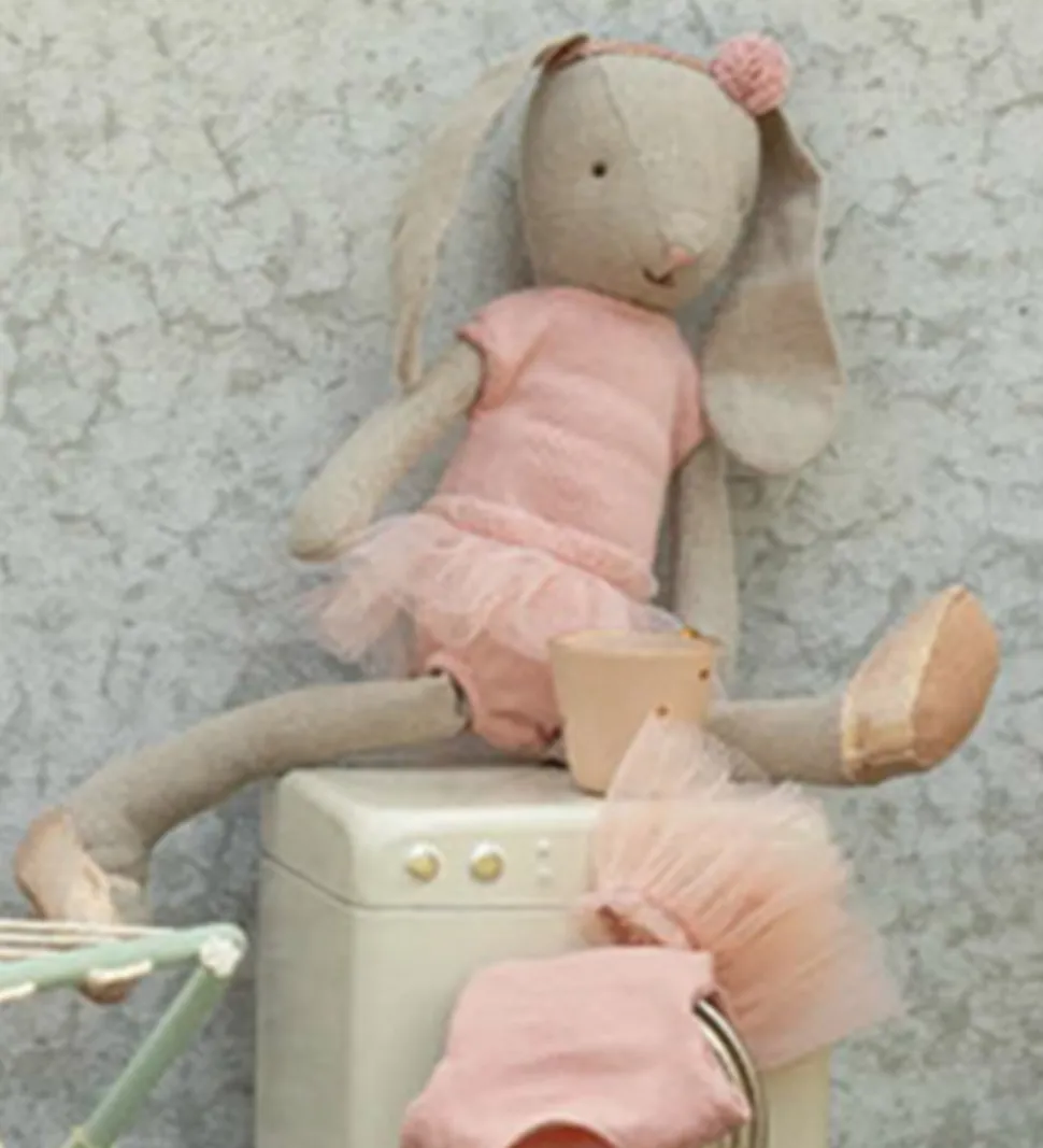 Fin Maileg kanin i lysegrå iført en rosa balletdragt og et tylskørt.