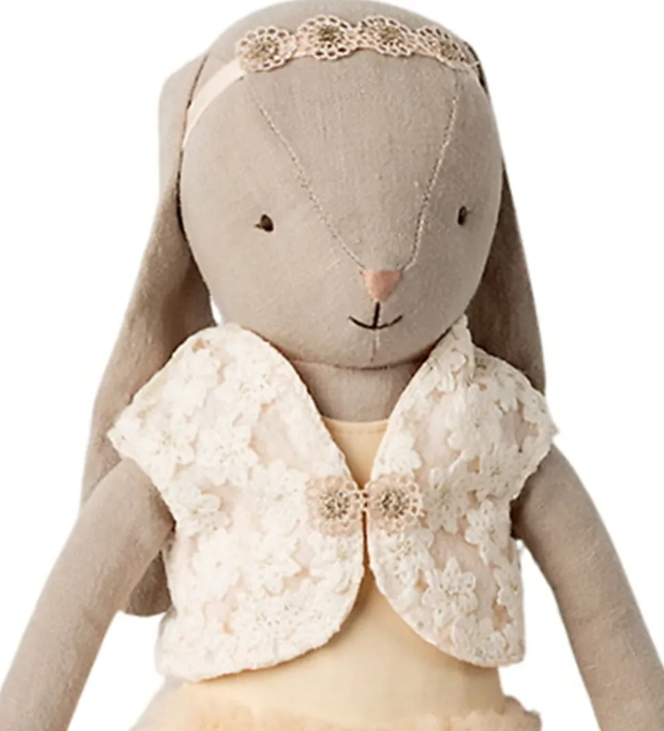 Fin Maileg kanin i lysegrå iført en gul balletdragt og et tylskørt samt en fin vest.