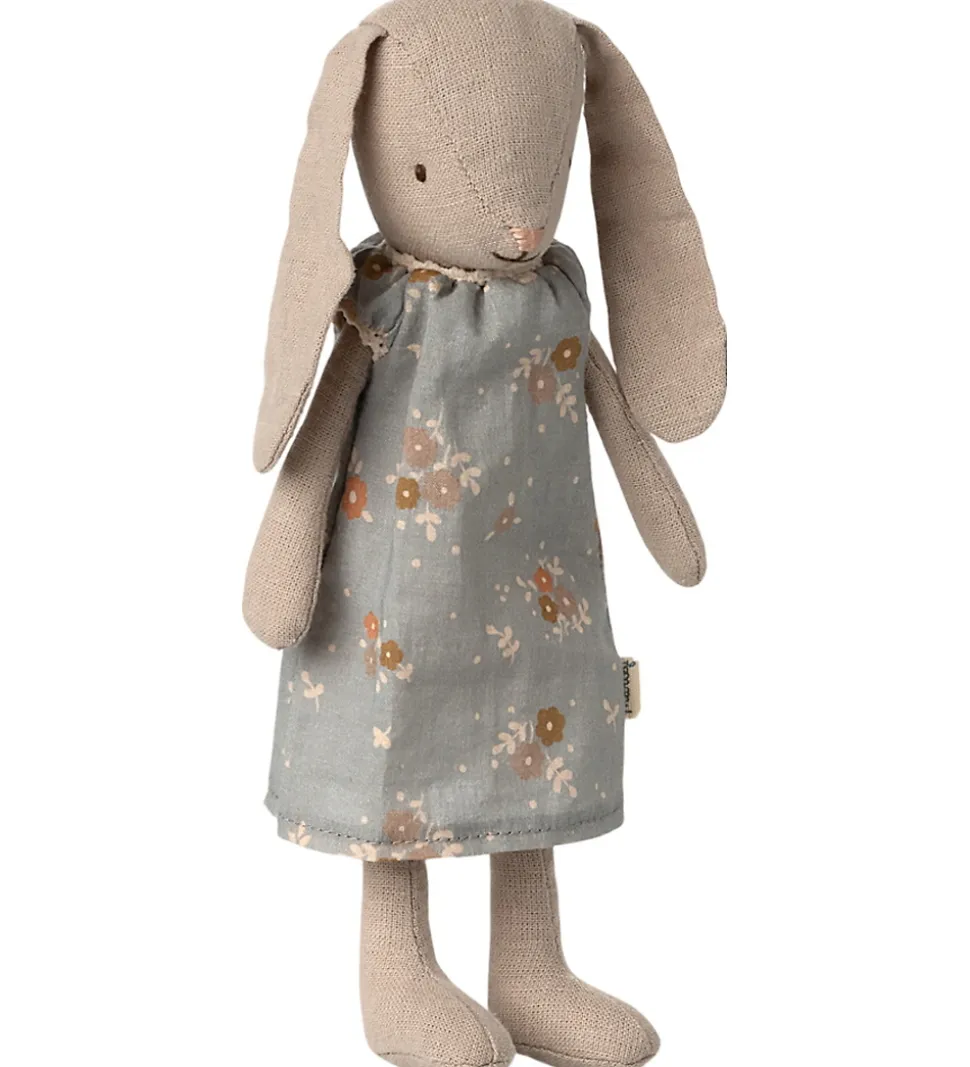 Charmerende Maileg kanin iført en blå kjole med blomsterprint i delikate nuancer.