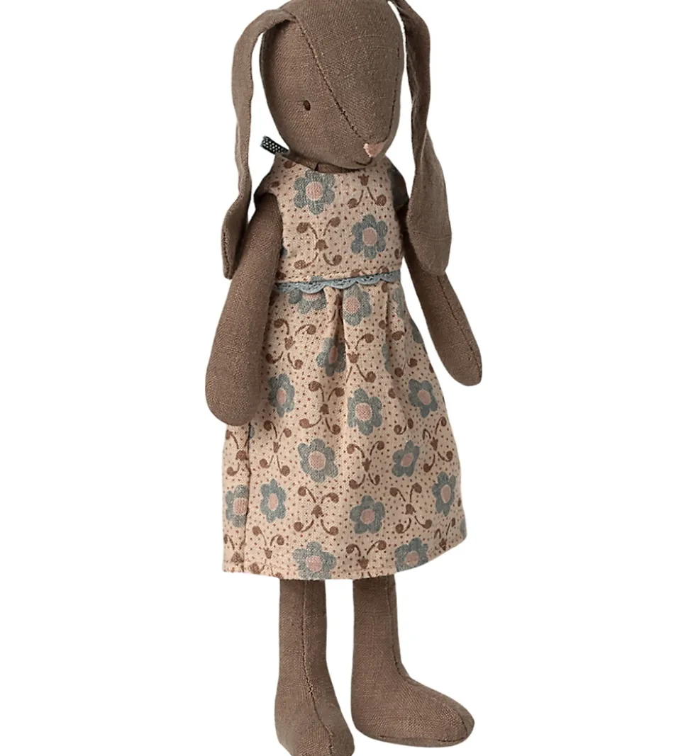 Charmerende Maileg kanin iklædt en lys beige kjole med et smukt blomsterprint.