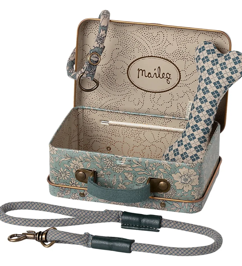Charmerende Maileg kuffert med hundetilbehør i blå med blomsterprint i beige nuancer. Sættet inkluderer en sød, lille stofknogle og en hundensnor med matchende halsbånd i blå og beige nuancer.