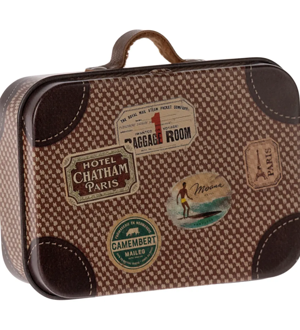 Flot Maileg kuffert i brun med beige prikker og brune hjørner, samt et print af vintage klistermærker. Kuffertens håndtag er fremstillet af imiteret skind i brun.