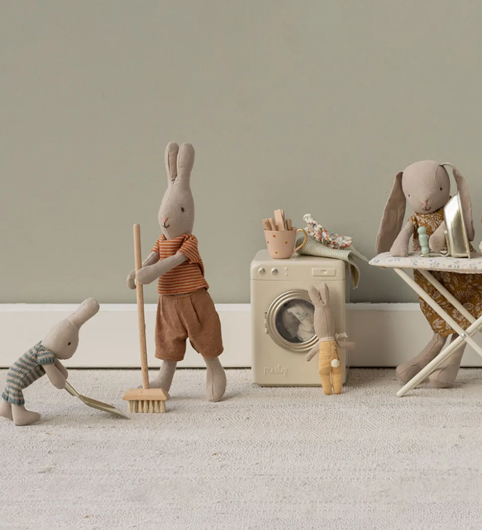 Praktisk Maileg fejesæt der bstår af en kost med træhåndtag og en fejebakke i en metallisk farve. Skab realistiske rollespilsoplevelser med Maileg.