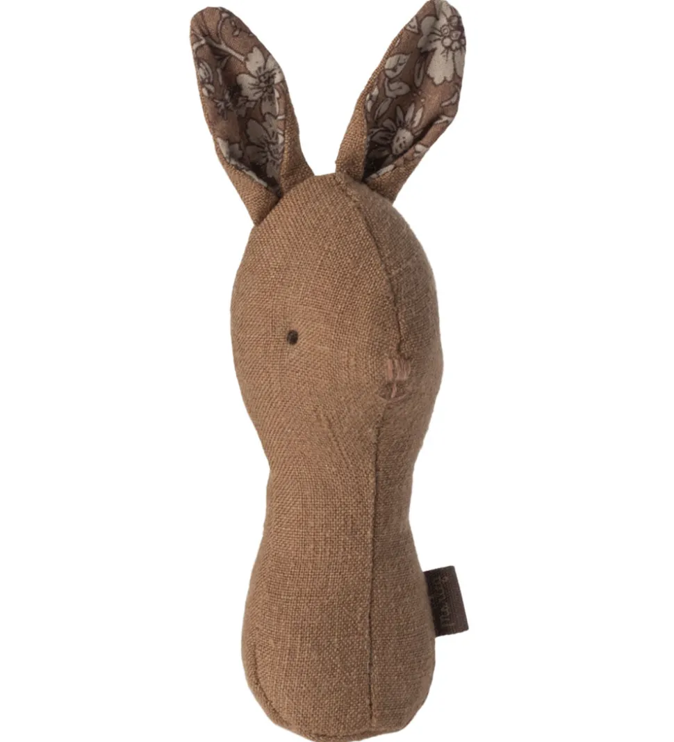 Fin Maileg rangle i hør formet som en kanin i brun med store ører i brunlig rosa med blomsterprint.