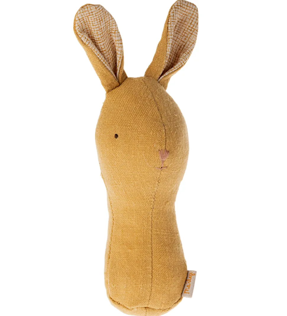 Sød Maileg rangle formet som en gul kanin med et sødt ternet print på indersiden af ørene.