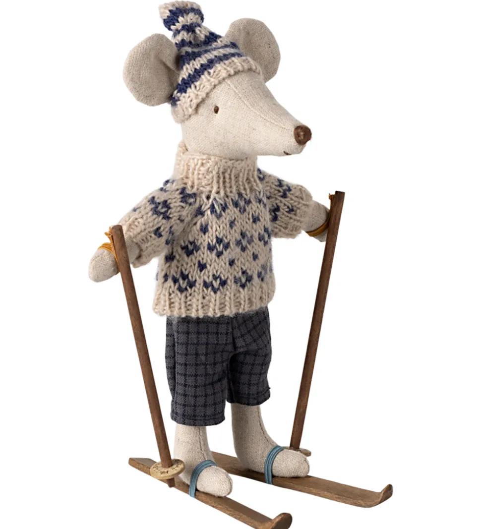 Maileg dukken er udstyret med ski, perfekt til leg og eventyr.