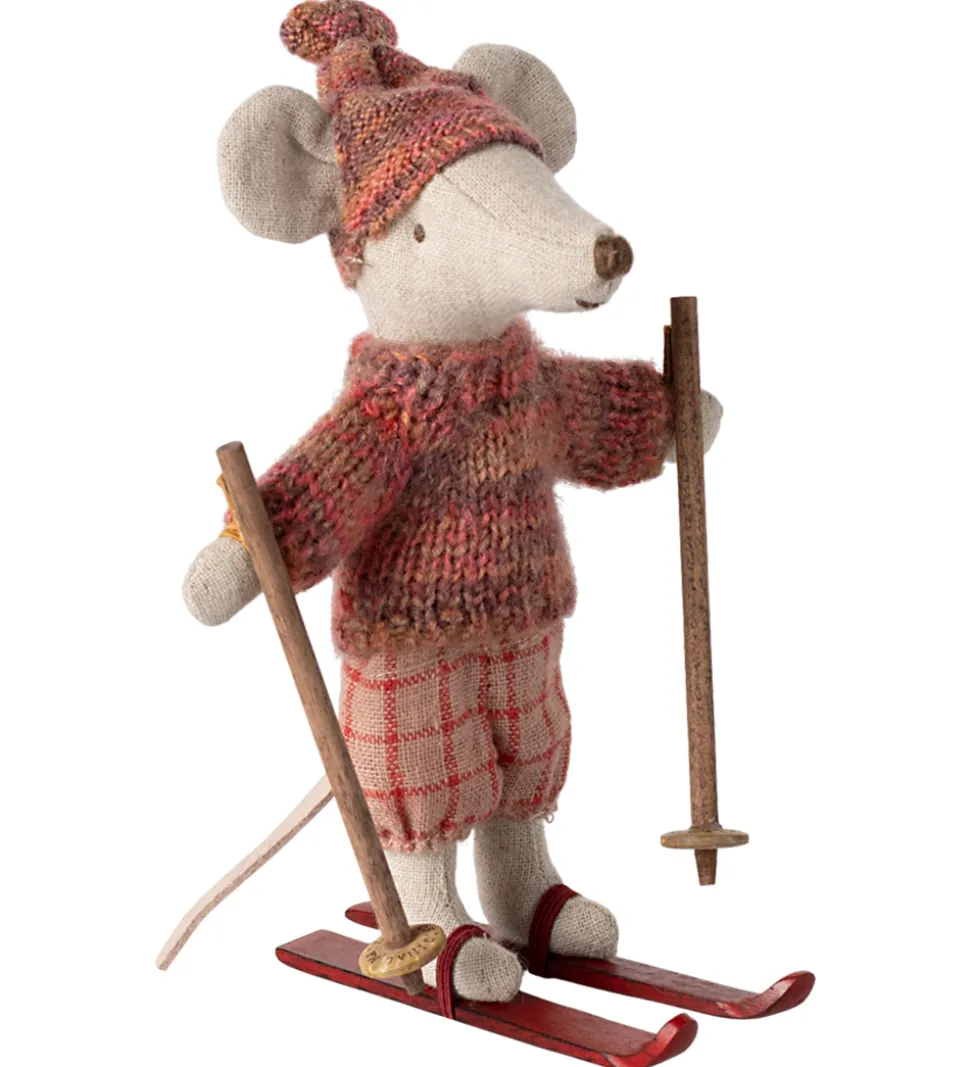 Maileg dukken er udstyret med ski, perfekt til leg og eventyr.