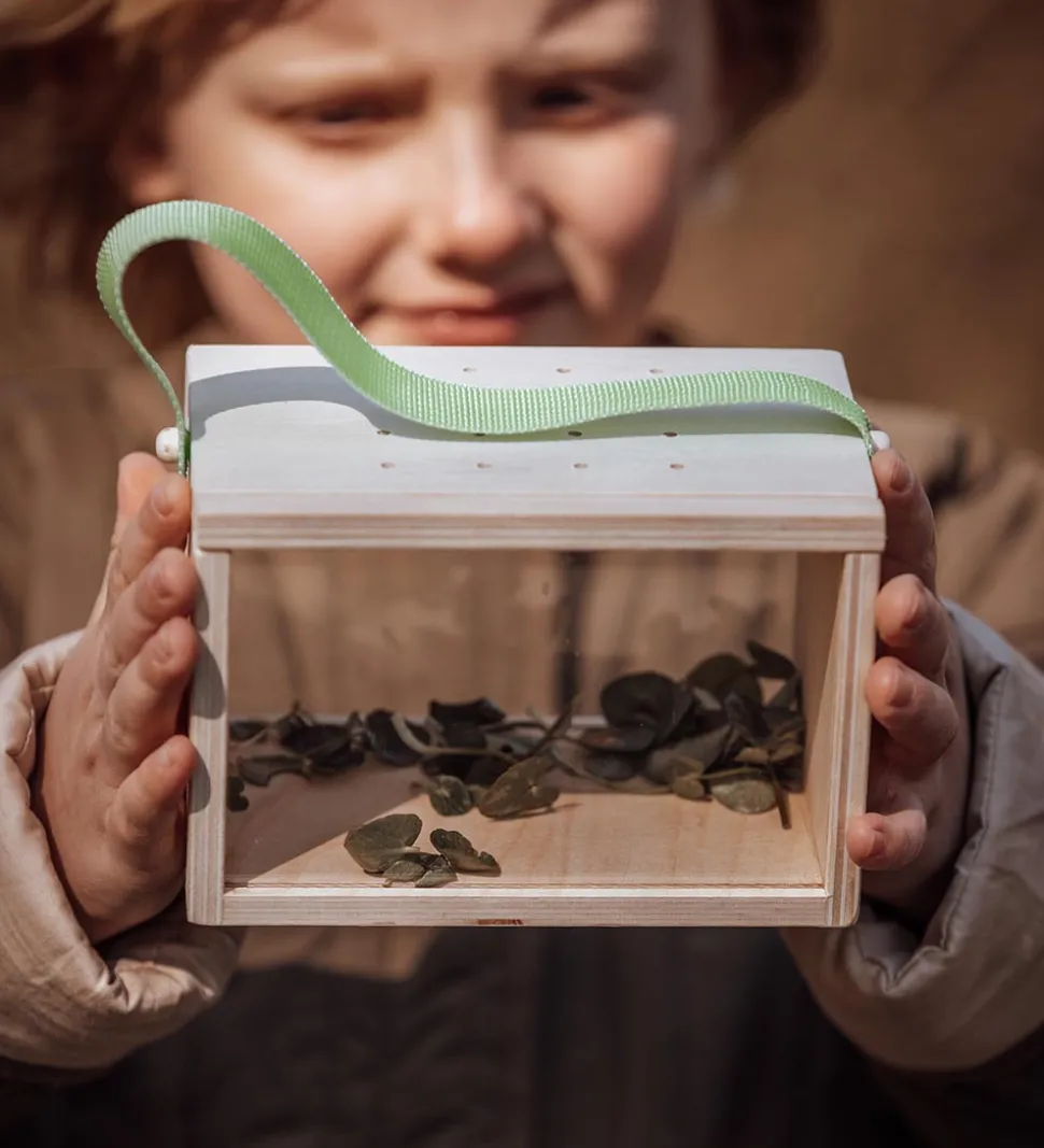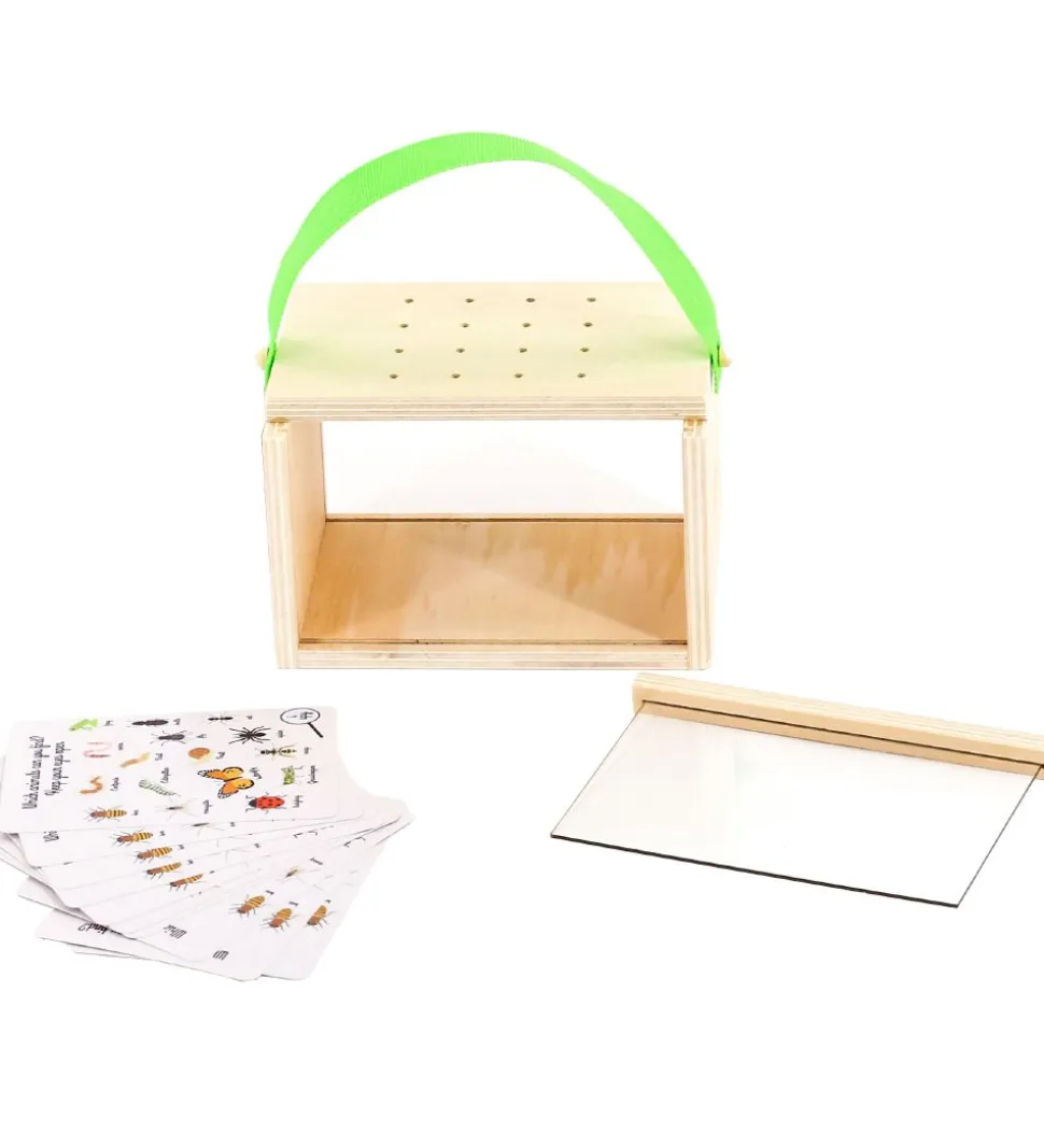 Fint MaMaMeMo insekthus i træ og gennemsigtigt akryl med et grønt håndtag.