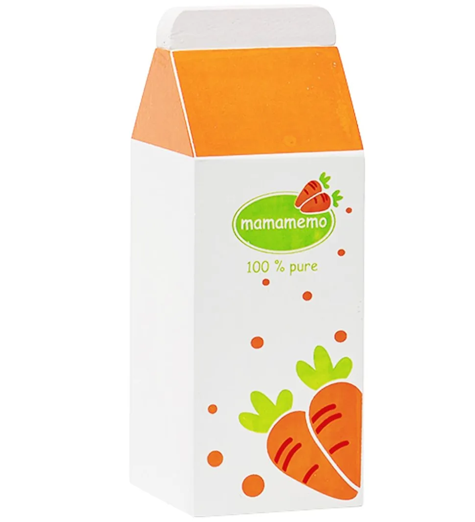 Underholdende MaMaMeMo legemad bestående af en orange karton gulerodssaft.