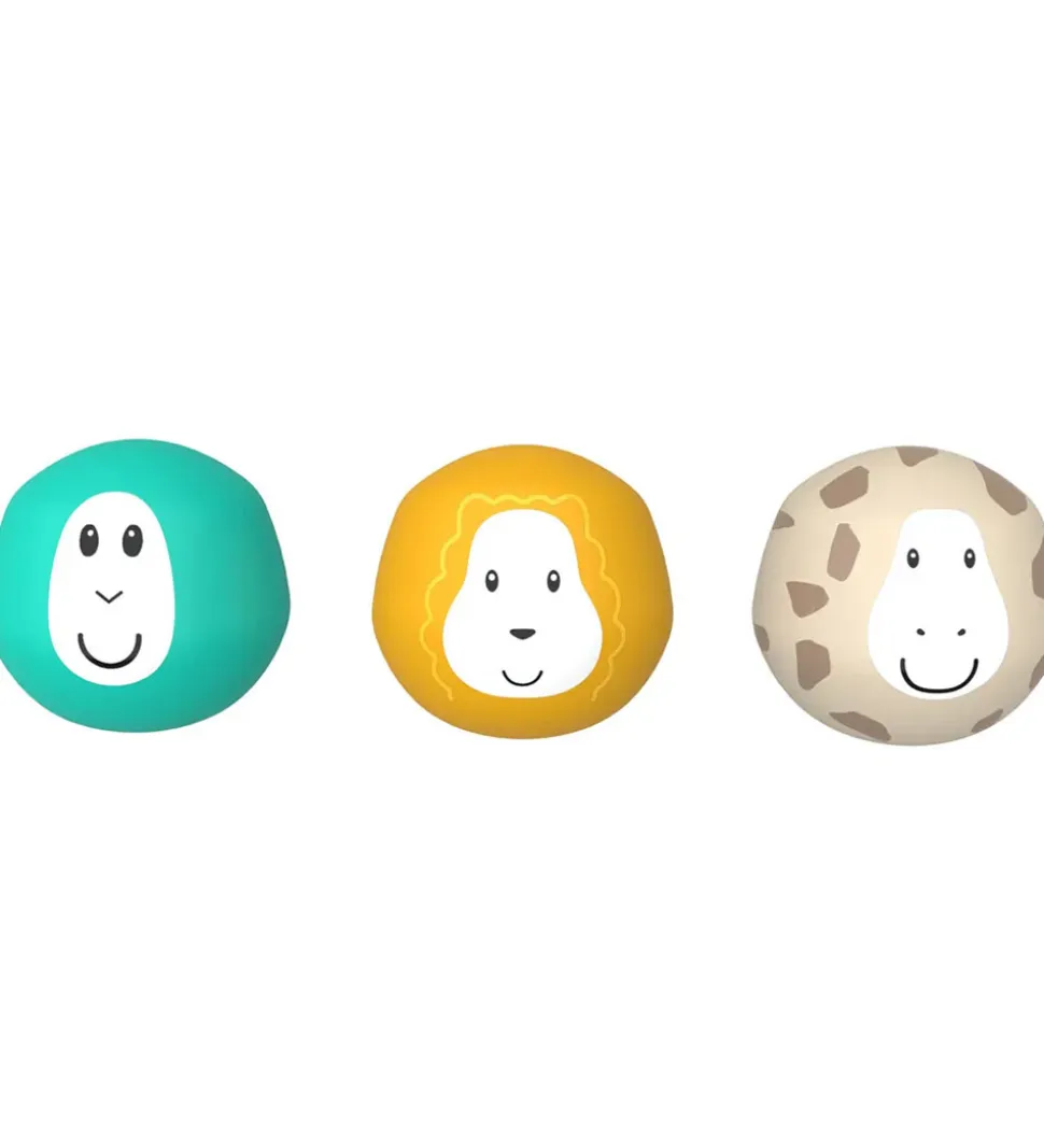 Sjovt Matchstick Monkey badelegetøj i form af en pink glidebane og tre farverige bolde med ansigter.