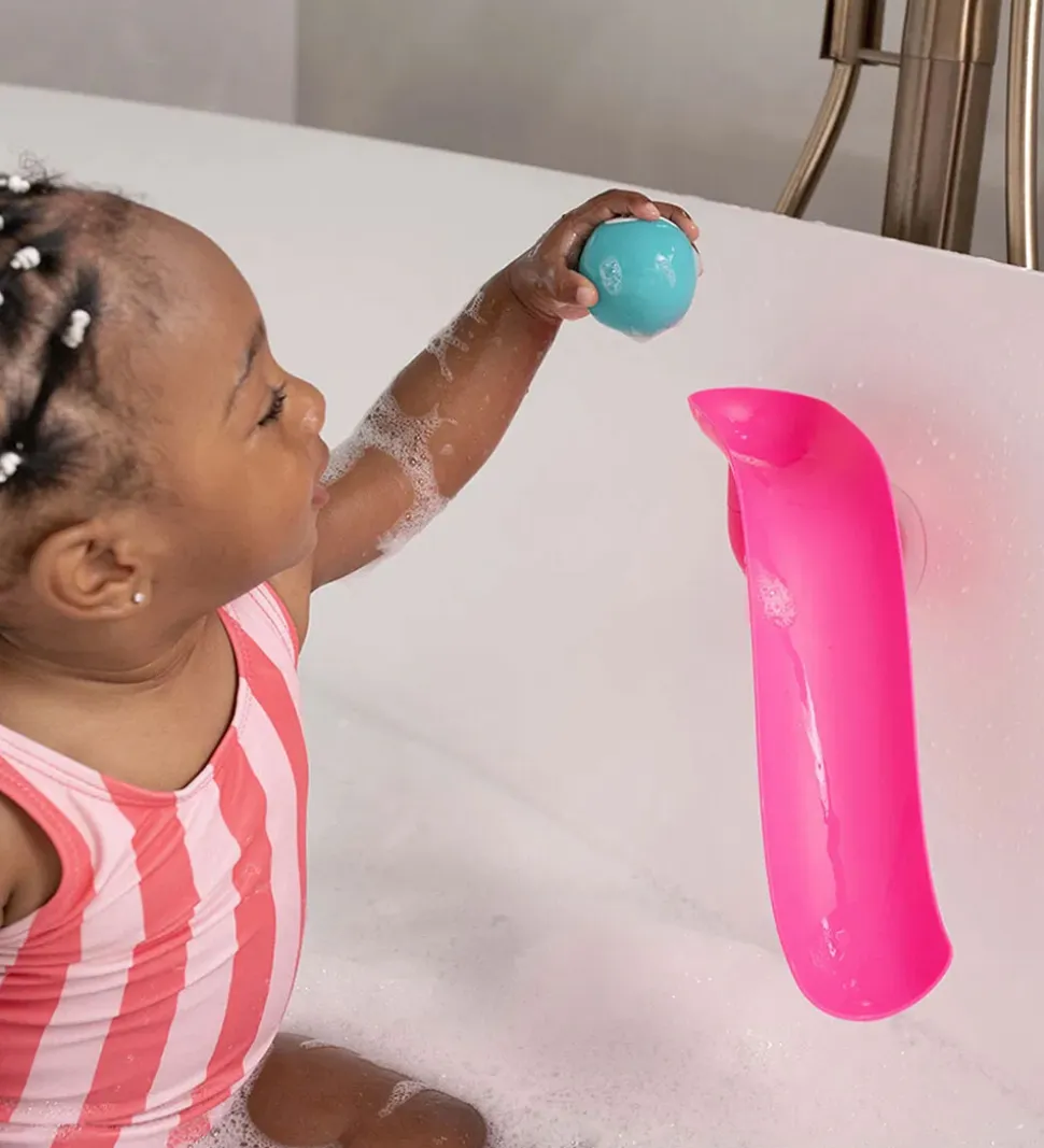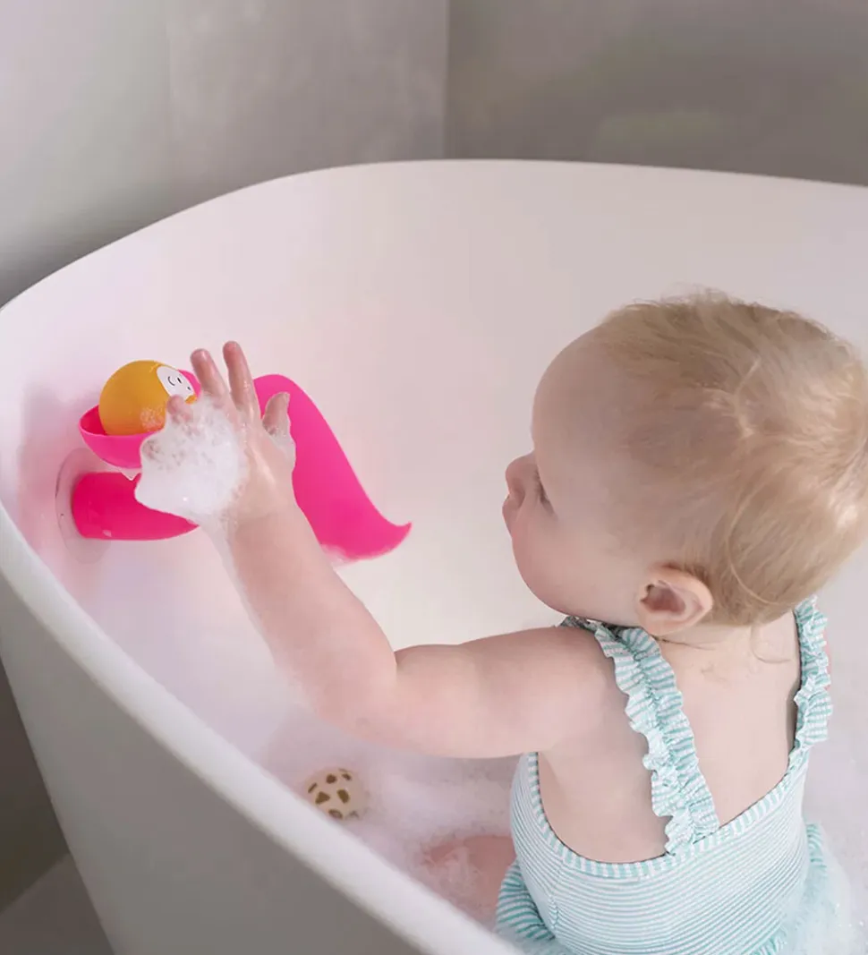 Matchstick Monkey glidebanen sættes fast på klinkerne på badeværelset eller badekaret ved hjælp af en sugekop. Boldene placeres øverst på glidebanen, hvorefter de glider ned i vandet. Badelegetøjet hjælper med at styrke barnets øje-hånd koordination og finmotorik, og indbyder til sjov og leg i badekaret.