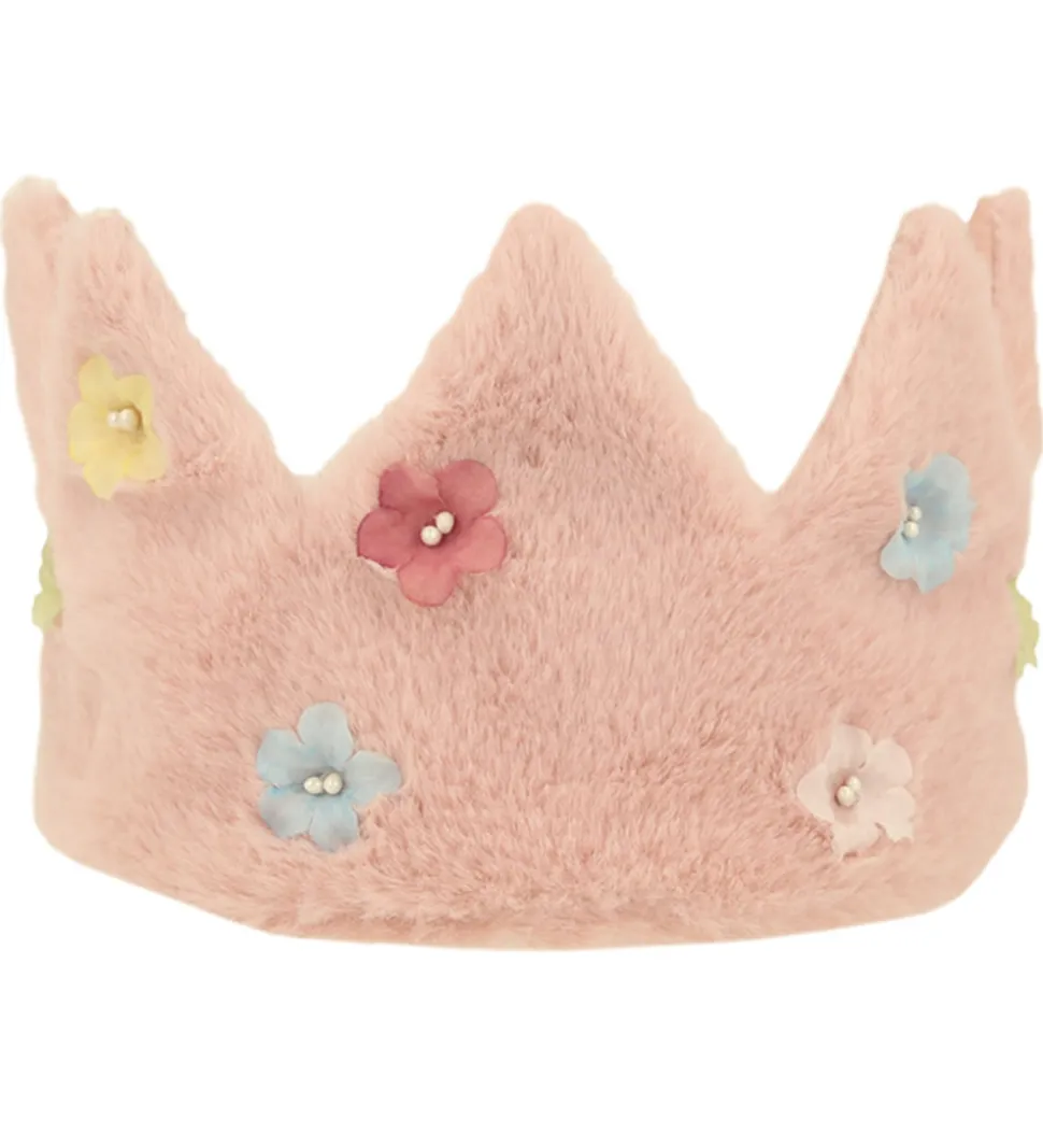 Fin Meri Meri udklædning bestående af en krone i støvet rosa plush med flotte blomster i forskellige farver.