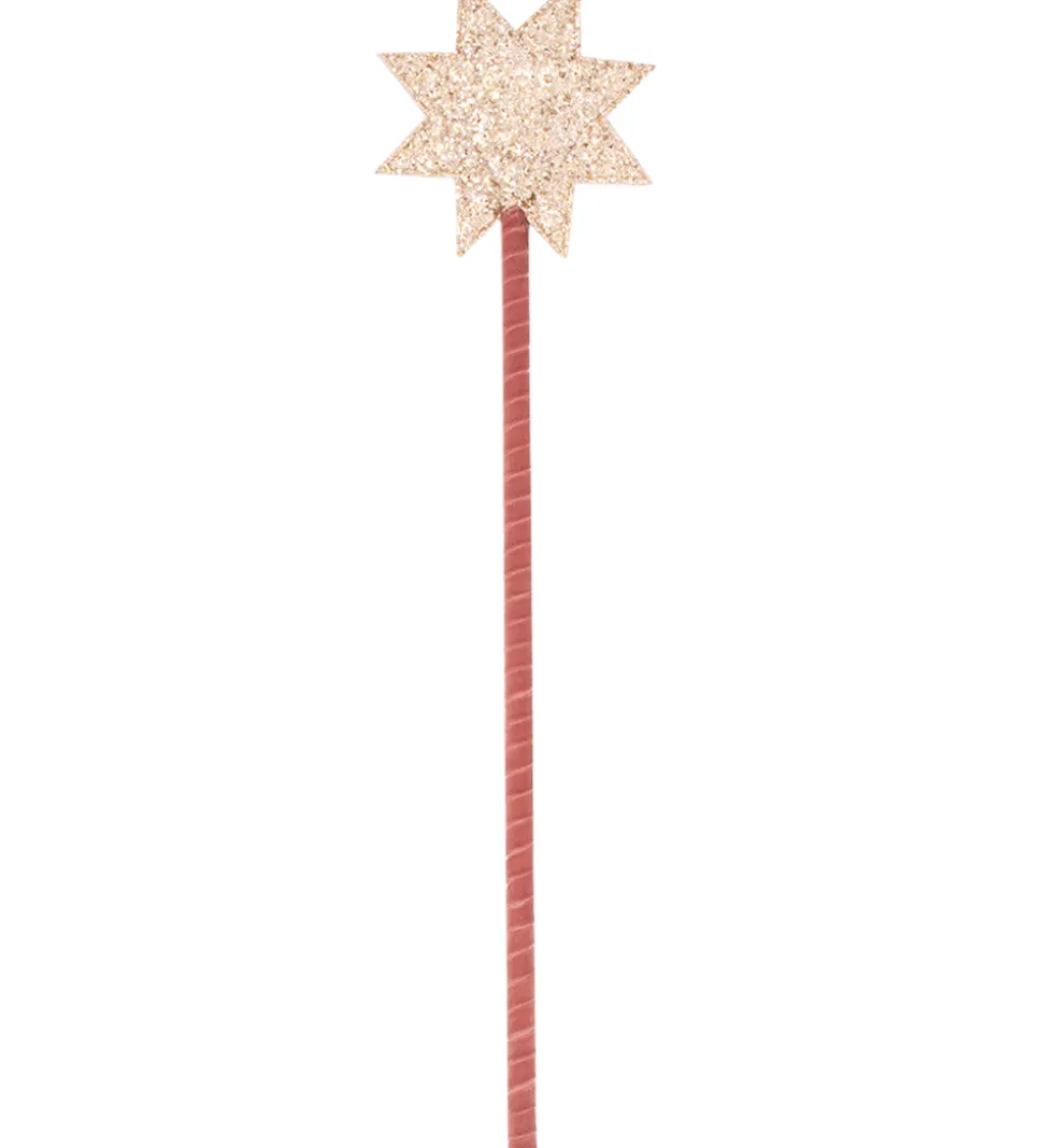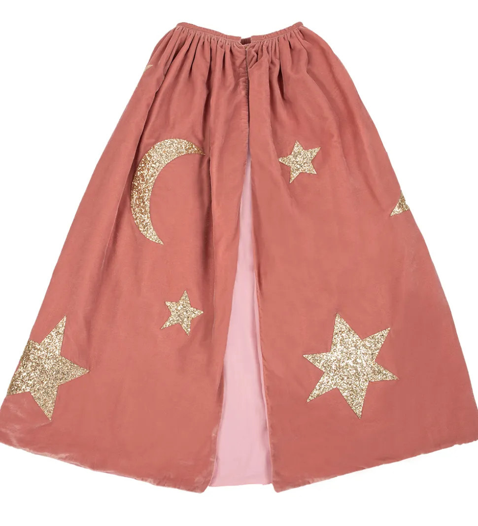 Flot Meri Meri udklædning i rosa velour med guldfarvede stjerner og måner. Sættet består af en spids hat, en kappe og en tryllestav, så man kan ligne en flot troldmand.