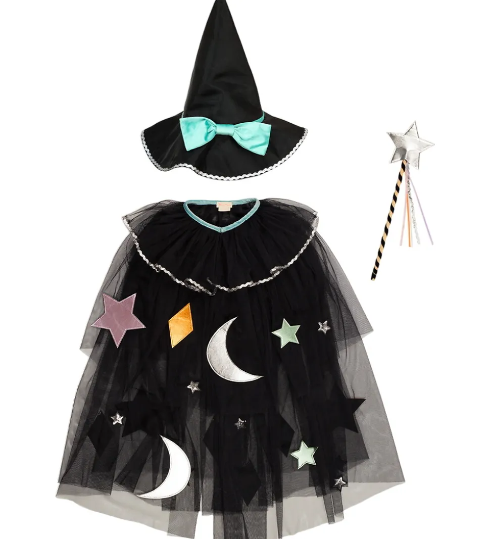 Charmerende Meri Meri udklædning bestående af en kappe i tyl med farverige og metalliske motiver. Med kappen kommer en spids hat og en tryllestav. Perfekt til fantasifulde eventyr.